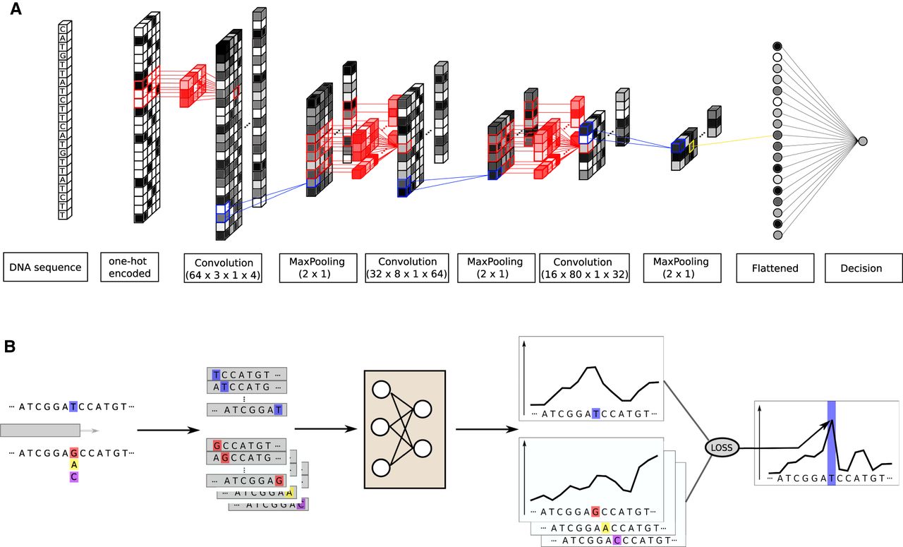 CNN architecture and mutation score computation. (A) The model is trained to predict the nucleosome density at the center position of a 2001-bp-long DNA sequence. It contains three convolutional layers with max-pooling, batch-normalization, and dropout. The final convolutional layer output is flattened and fed to a single output neuron. (B) We test all the possible mutations at the position indicated in blue, here a T, and predict the nucleosome density around this position with and without mutations. The mutation score is the Z-normalized sum of the distance between the wild-type density and all the mutated type. The loss function used to train the network is used to compute the distance.