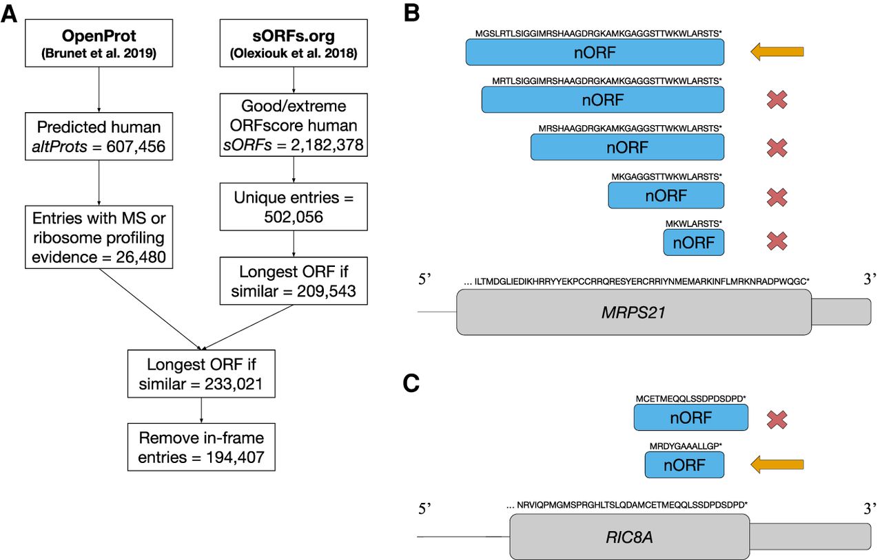 Flow chart for the curation of the nORFs data set. (A) Steps illustrating the workflow to curate nORFs entries. From OpenProt, all predicted human altProts were filtered to entries with MS or ribosome profiling evidence (26,480). From sORFs.org, all human sORFs with an ORFscore of good or extreme were filtered to unique entries (502,056) and then summarized to the longest ORF at sites with multiple ORFs. Entries were then merged, the longest ORF was selected at multiple ORF sites, and in-frame entries were removed, leaving a total of 194,407 nORFs in the final data set. (B) An example of selecting the longest ORF for five small ORFs (smORFs) in an alternative frame of the final coding exon of the MRPS21 gene. In cases in which the ORFs share the same end site and differ only by their start site, we retain the longest ORF, indicated by the orange arrow, and remove the shorter ORFs, indicated by the red cross. (C) An example of removing in-frame entries in which two smORFs overlap the CDS of the RIC8A gene. The ORF in the same frame as the RIC8A CDS is removed from the data set as indicated by the red cross, whereas the second ORF in a different frame is retained in the data set, indicated by the orange arrow.