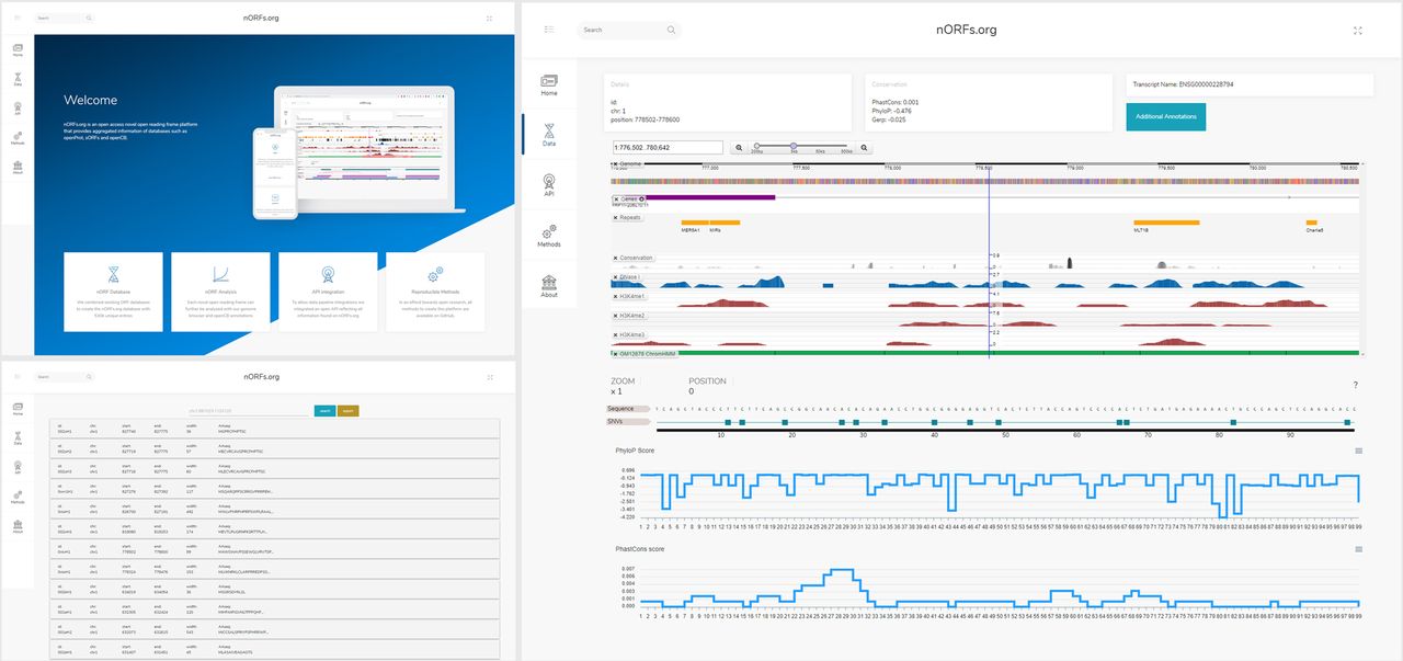 Overview of platform. The nORFs.org platform contains six individual pages (three shown above) that introduce the platform, methods, and nORF entries. The nORF detail page (right) is divided into three sections: The meta data section includes the unique identifier, genomic position, and experimental sources; the (biodalliance) genome browser displays genes, repeats, conservation, and epigenetic information such as DNase I binding sites, and histone modifications (H3K4me1-me3); and the protein sequence section can be used for biostatistical pipelines to display variants, topology, and alternative splicing.