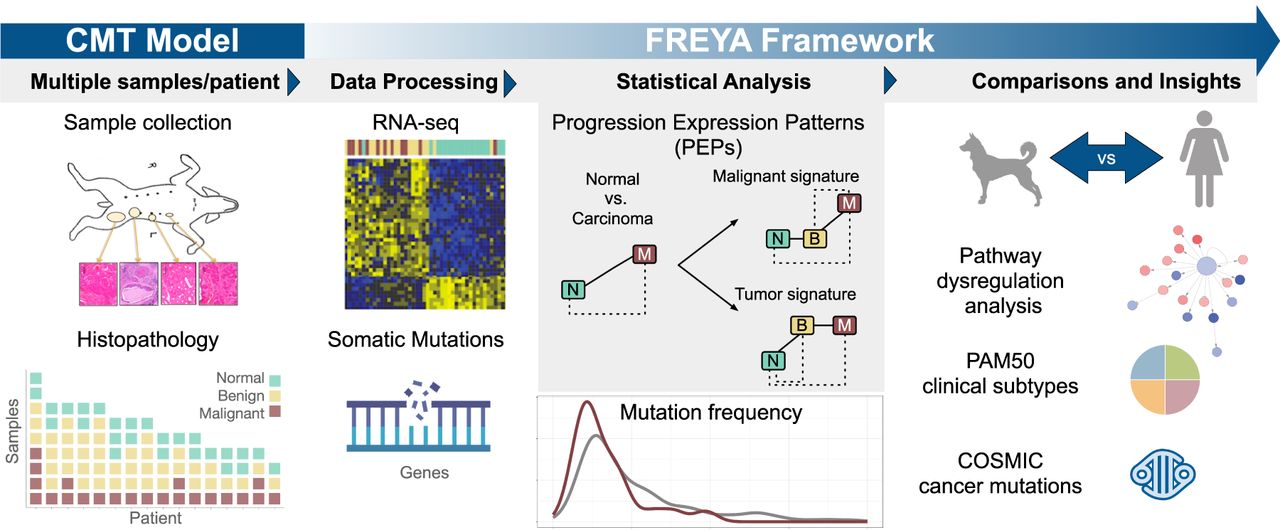 Multiple CMTs per patient model enables discovery of carcinoma-specific processes that inform human BRCA. (Left) CMT model. Tissue samples were collected and annotated for each of the 89 samples from 16 canine patients. For study inclusion, each patient was required to provide a minimum of one sample (represented by colored blocks) from each histological group: normal (green), benign (yellow), and malignant (red). Many of the dogs have multiple samples of different tumor histologies. (Right) FREYA framework. We developed the FREYA framework to study tumor development. Using FREYA, we analyzed multiple primary tumors per patient with RNA and mutation profiling and developed a statistical framework to determine differences in gene expression between normal, benign, and malignant samples, and we compared CMT molecular signals to human breast cancer.