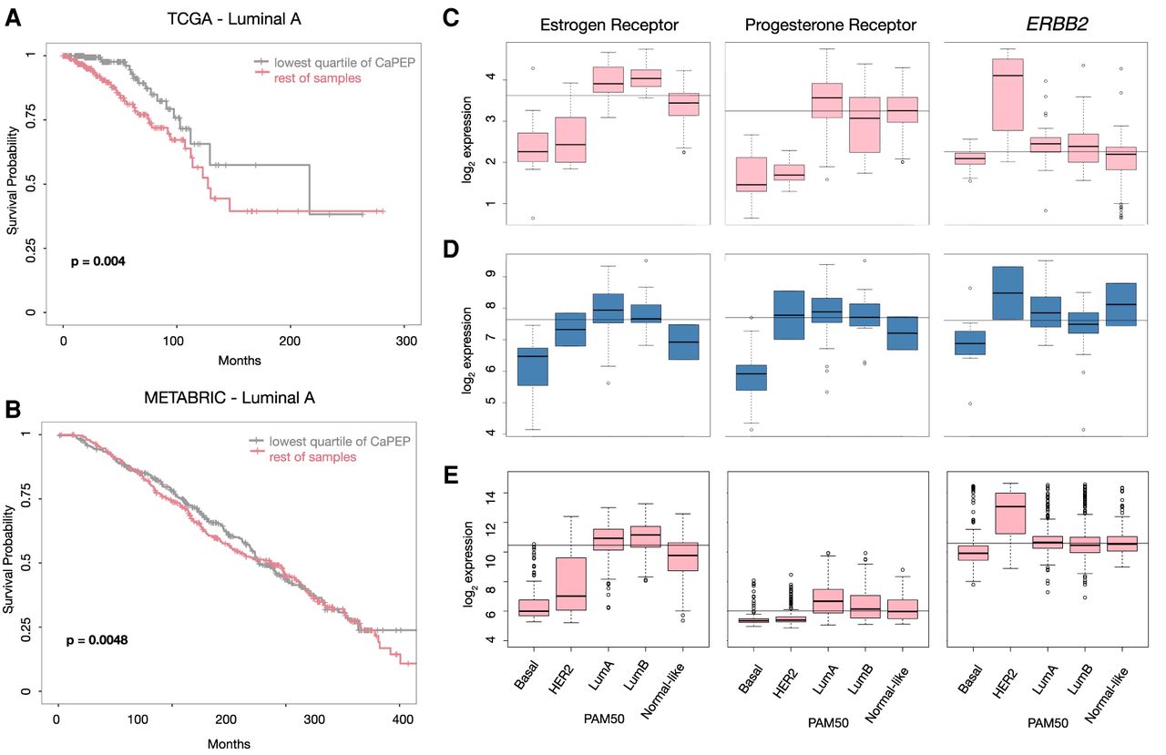 Dog PEP signature is predictive of survival in human breast cancer. (A,B) Kaplan-Meier plots showing patients with breast cancers bearing strongest Carcinoma PEP signal have worse outcomes in two independent human breast cancer cohorts: (A) TCGA BRCA; (B) METABRIC. (C–E) Dogs, like humans, have strong hormone receptor expression signaling differences between PAM50 subtypes. Estrogen receptor 1 (ESR1), progesterone receptor (PGR), and erb-b2 receptor tyrosine kinase 2 (ERBB2) expression within each PAM50 subtype shown: (C) TCGA BRCA; (D) this CMT data; and (E) METABRIC. Horizontal lines across each graph indicate median receptor expression across the entire cohort.