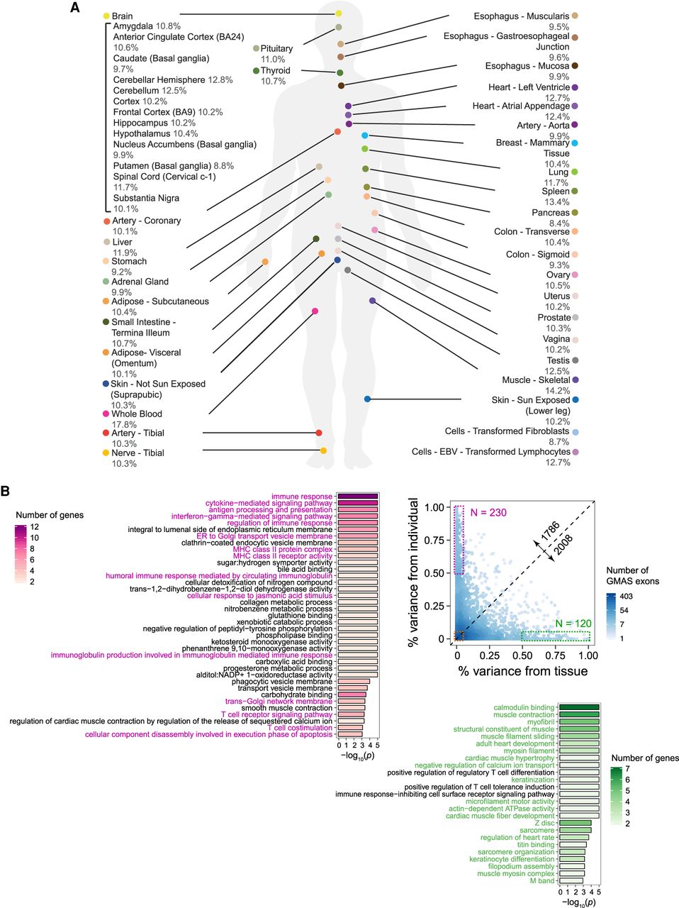 The landscape of GMAS exons in human tissues. (A) % of GMAS exons among all testable exons in each tissue (averaged across individuals). (B) The variability of GMAS patterns across tissues and individuals (Methods). Each dot represents an exon, and the colors represent the number of overlapping dots. This analysis only included GMAS exons that exist in ≥2 individuals per tissue and ≥2 tissues per individual. The numbers along the diagonal line show the number of GMAS exons above and below the line, respectively. GO terms enriched among genes in the high variability groups (boxed) are shown. Color intensity represents the number of genes associated with each significant GO term. The P-values were estimated based on 10,000 randomizations of control genes (i.e., genes hosting alternatively spliced exons that were tested for GMAS) matching gene length and GC content of the test genes (Hsiao et al. 2016a). The significant cutoff of the P-value was set to be 1/(number of total GO terms considered).