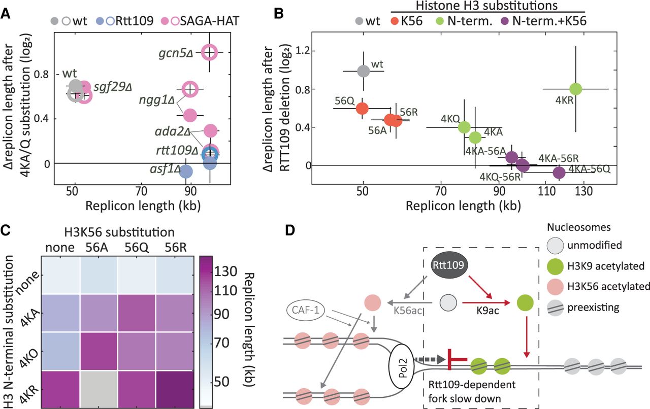 Rtt109 acts via H3 N-terminal acetylation to reduce fork velocity. (A) Genetic interaction between histone N-terminal acetylation and Rtt109 or SAGA/SLIK complexes. Relative replicon length change (log2) after an N-terminal substitution (4KQ, open circle; 4KA, closed circle) in wt (gray), RTT109-deleted (blue), or SAGA-HAT-core subunit-deleted (pink) cells is plotted against their replicon length (x-axis in log scale). (B) Genetic interactions between RTT109 and histone acetylation during DNA replication. For each lysine H3 N-terminal and K56 substitution (naming as in Figs. 3A, 4A), and their combinations, the relative replicon length (log2) after RTT109 deletion is plotted against its replicon length without RTT109 deletion. Gray indicates wt; red, H3K56 substitutions; green, N-terminal substitutions; purple, combined H3K56 and N-terminal substitutions; x-axis in log scale. (C) Synergistic effect of H3K56 and H3 N-terminal substitutions on DNA replication dynamics. The replicon lengths of mutants with combinations of H3K56 (columns) and H3 N-terminal 4K (rows) substitutions are shown. Colored squares indicate the replicon length after combining N-terminal mutation; gray squares indicate missing data for 4KR + K56A. (D) A working model: Histone H3 N-terminal acetylation by Rtt109 promotes nucleosome deposition in front of the fork and thus slows DNA replication.