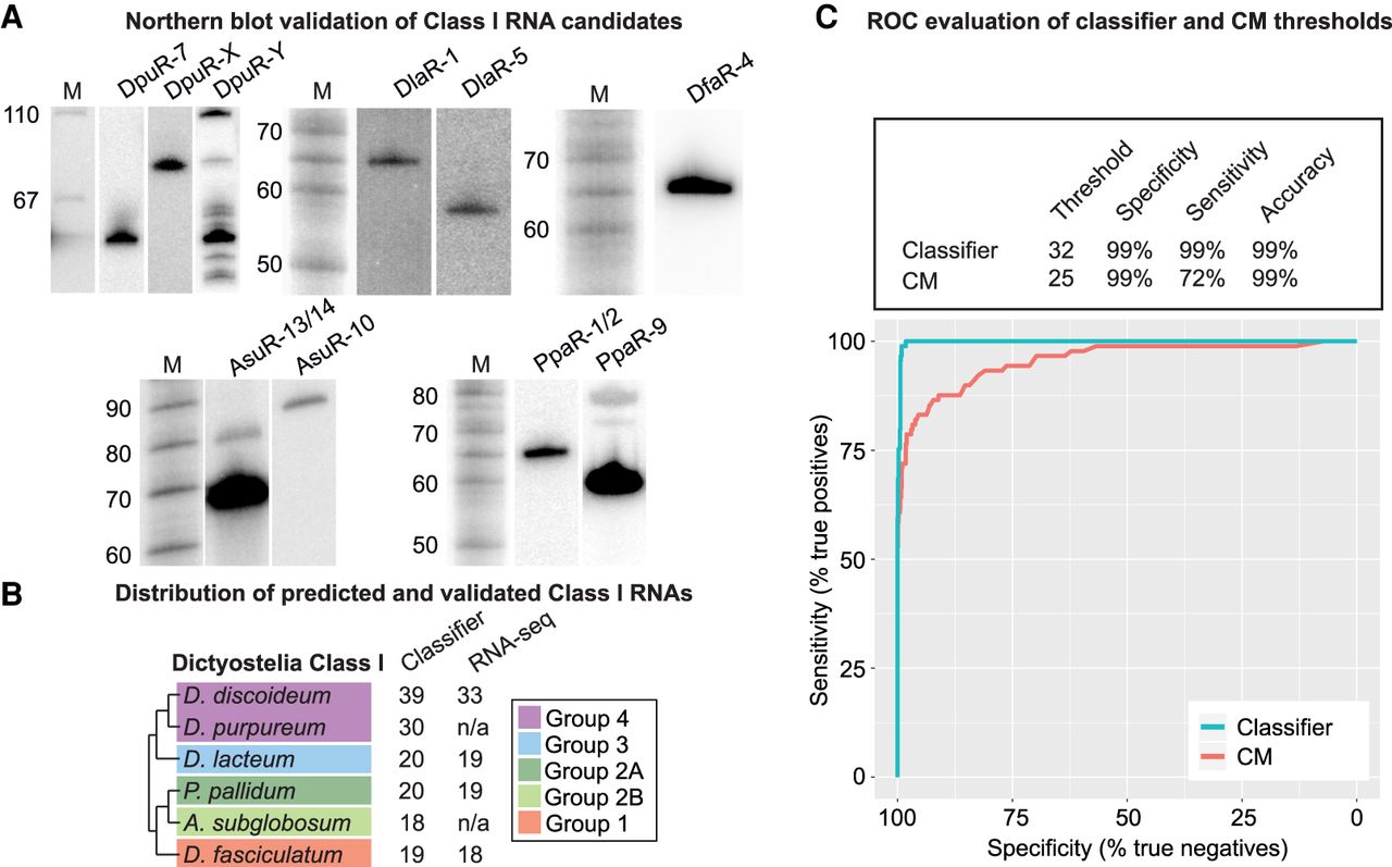 Expression of predicted Class I RNA genes. (A) Northern blot validation of different Class I RNAs from D. purpureum (DpuR), D. lacteum (DlaR), D. fasciculatum (DfaR), A. subglobosum (AsuR), and P. pallidum (DpaR). The number after the species-specific designations indicates which Class I RNA the probe recognizes. When two numbers are given, the probe recognized two different Class I RNAs. DpuR-X indicates that the probe is expected to hybridize to six different Class I RNAs predicted to be 85 nt long. DpuR-Y indicates that the probe is expected to hybridize to 24 Class I RNAs. For each organism except for D. fasciculatum (DfaR), the same membrane was probed, stripped, and reprobed for the different Class I RNAs. Radioactively labeled size marker is indicated by M, and numbers to the left indicate sizes in nucleotides. (B) Number of Class I RNA genes in each species according to the classifier. RNA-seq designate the number of expressed Class I RNA genes verified by RNA-seq. (C) ROC curves based on the RNA-seq validation and either classifier score or CM score for all Class I candidates in D. discoideum, D. lacteum, P. pallidum, and D. fasciculatum identified in the CM search. Input data are available in Supplemental Table S2. Evaluation of the classifier and CM thresholds used throughout the study are shown above the plot. Individual ROC curves for each organism are found in Supplemental Figure S3.