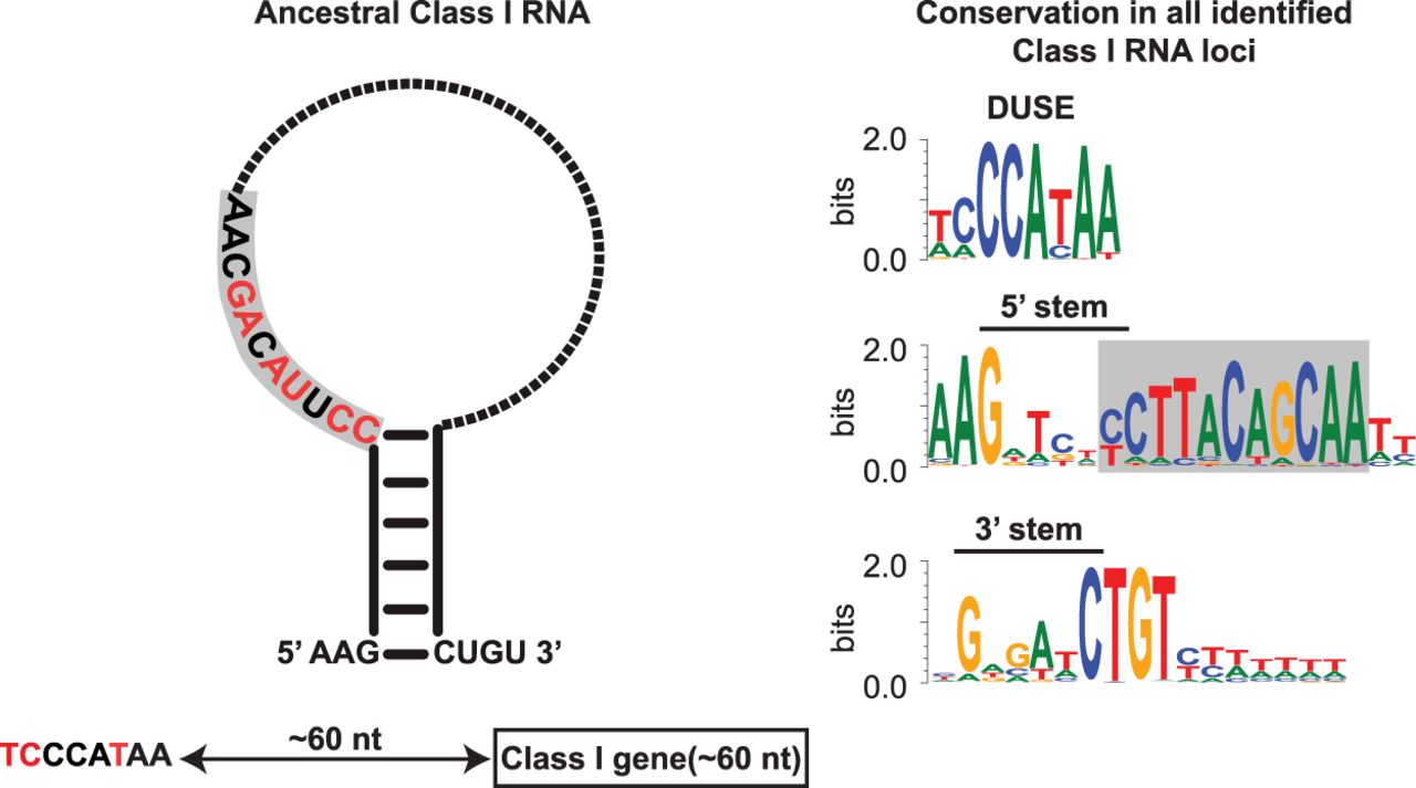 Ancestral Class I RNA and conserved key features. (Left) Schematic representation of the ancestral Class I RNA transcript. The putative promoter element DUSE and its distance to the Class I RNA gene is indicated below the Class I RNA structure. Strongly conserved features, nucleotides and base-paired stem, are colored black, whereas red denotes more variable positions (based on data presented in Fig. 3). The dotted part of the loop indicates highly variable sequence. (Right) Sequence logos of alignments of conserved sequence motifs from all identified and curated Class I RNAs. Only DUSE identified at the correct distance were included in the alignment. The 11-nt motif is boxed in gray in both the ancestral Class I RNA (left) and sequence logo (right).