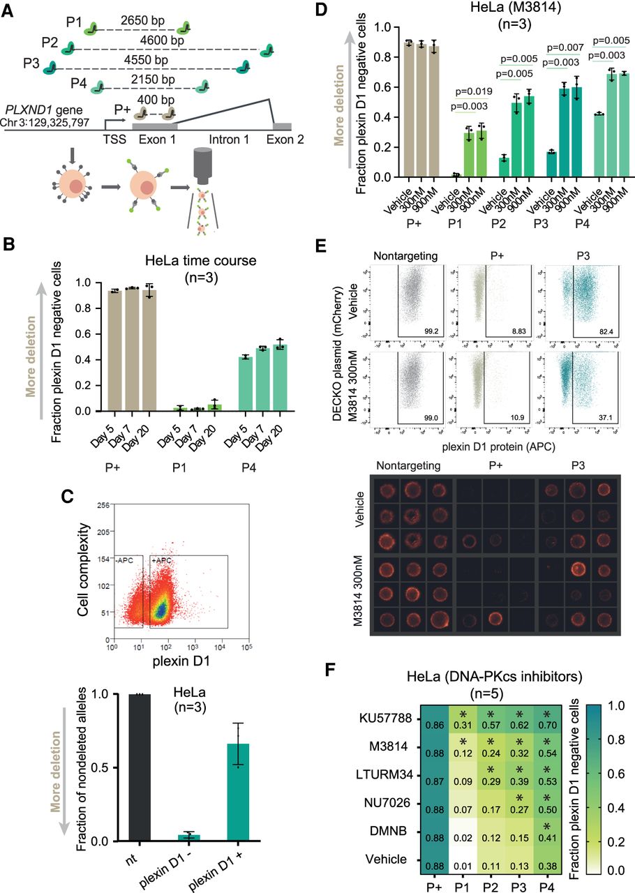 CiDER reporter system identifies DNA-PKcs inhibition as a means to increase CRISPR-del efficiency. (A) The CiDER endogenous reporter relies on a series of sgRNA pairs targeting exon 1 of PLXND1 gene, whose protein product is detected by flow cytometry. (B) CiDER measurements of CRISPR-del efficiency over a range of times between sgRNA delivery and cell harvesting (mean, standard deviation). (C) Independent evaluation of CRISPR-del efficiency in sorted plexin D1–negative and D1–positive cells. (Top) Representative fluorescent activated cell sorting (FACS) plot. Plexin D1–negative (APC-) and Plexin D1–positive cells (APC+) are gated. (Bottom) The fraction of nondeleted alleles in each population quantified by qPCR (mean, standard deviation). The black bar corresponds to a nontargeting control used for normalization. Green bars correspond to sorted HeLa cells with pgRNAs targeting PLXND1 (P3). (D) CRISPR-del efficiency measured by CiDER in HeLa upon DNA-PKcs inhibition (mean, standard deviation, one-tailed paired t-test). (E, top) Representative raw flow cytometry plots for HeLa upon DNA-PKcs inhibition. Plexin D1–positive cells are gated, and numbers correspond to percentage of cells. (Bottom) Representative images of individual sorted, stained HeLa cells. (F) CiDER measurements of CRISPR-del efficiency in HeLa upon DNA-PKcs inhibition with indicated small molecules (values: mean plexin D1–positive cells; *P < 0.05, one-tailed paired t-test).