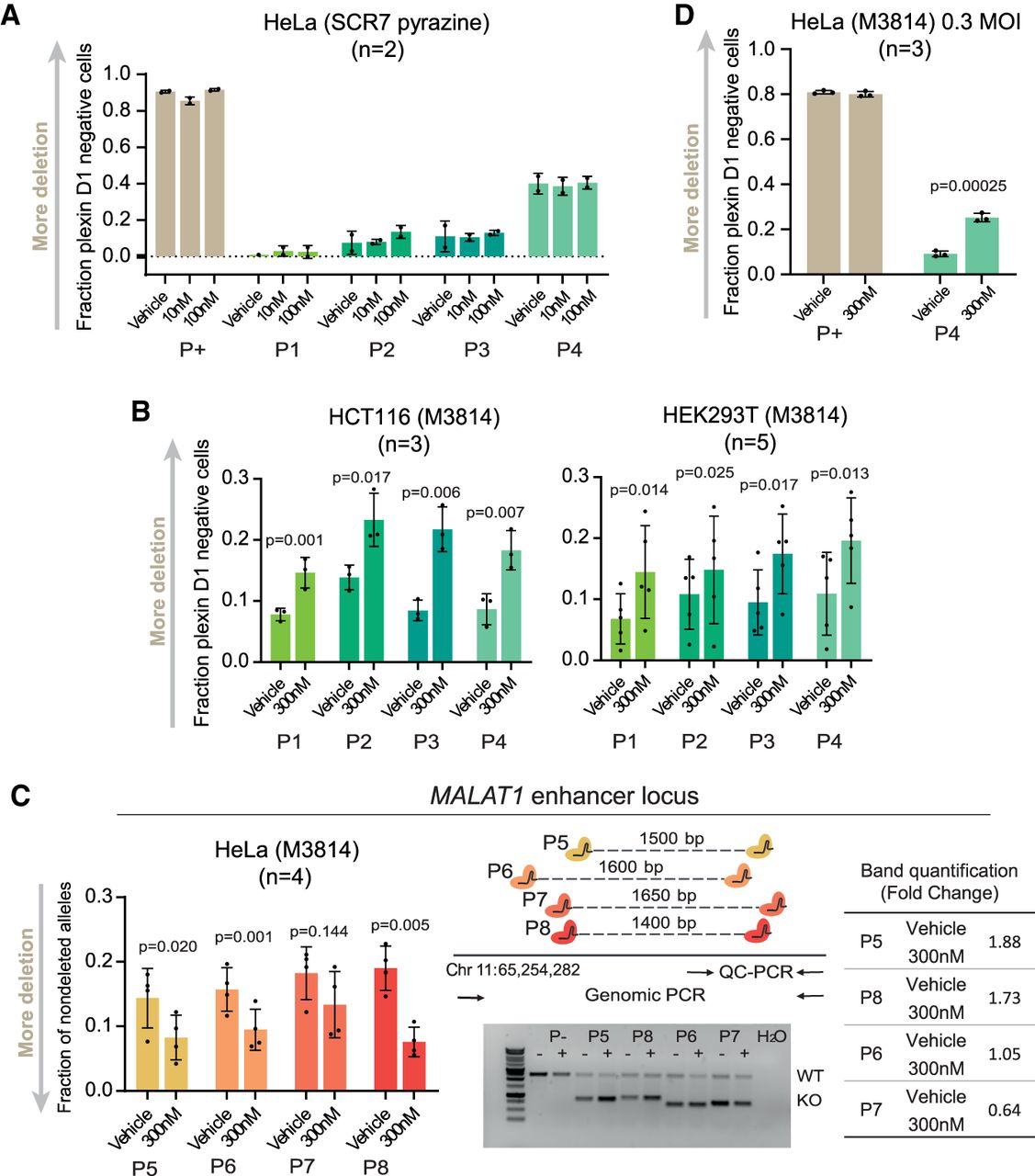DNA-PKcs inhibition boosts CRISPR-del independent of cell, readout, or sgRNA delivery method. (A) CRISPR-del efficiency of CiDER in HeLa upon DNA ligase 4 inhibition (mean). (B) CiDER measurement of CRISPR-del efficiency in HCT116 and HEK293T cell lines upon DNA-PKcs inhibition (mean, standard deviation, one-tailed paired t-test). (C) CRISPR-del efficiency at MALAT1-enhancer upon DNA-PKcs inhibition. (Left) The fraction of WT allele quantified by qPCR (mean, standard deviation, one-tailed paired t-test). (Center) The pgRNAs, PCR primers, and a representative agarose gel from the genomic PCR of the region. (Right) Quantification of the KO band from the gel. (D) CRISPR-del efficiency of CiDER in HeLa as a result of initiating DNA-PKcs inhibition at 24 h after lentiviral infection (MOI = 0.3).