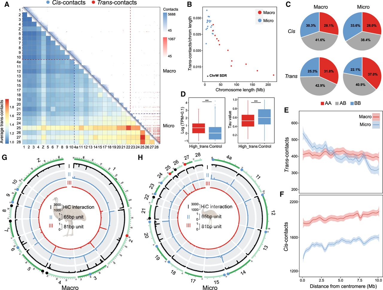3D chromatin contacts of macro- and microchromosomes. (A) Upper right panel: each blue triangle shows the cis-contacts of each chromosome measured by the numbers of Hi-C reads connecting any of the two 40-kb regions of the same chromosome. Microchromosomes exhibit more frequent trans-contacts measured by the number of Hi-C reads connecting any of the two 40-kb regions of two different chromosomes. The color is scaled to the contact strength, that is, the Hi-C read numbers. The lower left heat map shows the chromosome-wide average strength of trans-contacts between any of the two chromosomes. The dashed lines demarcate macro- and microchromosomes. (B) Microchromosomes show more trans-contacts than macrochromosomes, after being scaled by chromosome size, and the SDR of Chr W (black dot) shows very few trans-contacts. Each dot represents one chromosome (blue for microchromosomes, red for macrochromosomes). (C) Comparing different types of contacts connecting two active compartments (AA), two inactive compartments (BB), or active and inactive compartments (AB) between macro- and microchromosomes. (D) Genes that are overlapped with any of the 40-kb windows exhibiting the top 10% high levels of trans-contacts (‘High_trans’) have significantly higher expression levels and lower tau values (the lower the tau value is, the broader tissue expression the gene has) than the other genes, suggesting these are likely housekeeping genes. (***) P < 0.0005. (E,F) The average distributions of trans- or cis-contacts along the chromosomes with the distance away from the centromeres, suggesting centromeres have more impacts on the trans-contacts of microchromosomes than those of macrochromosomes. (G,H) From the outer to inner circles: (I) Hi-C contacts where the black lines indicate the punctuation of such contacts; (II) genomic distribution of 65-bp putative centromeric repeats (blue); (III) genomic distribution of 81-bp (red) centromeric repeats. The putative centromeres were annotated by one or two of these three sources of information, corroborated with karyotype information, and then color-coded accordingly on the chromosomes.