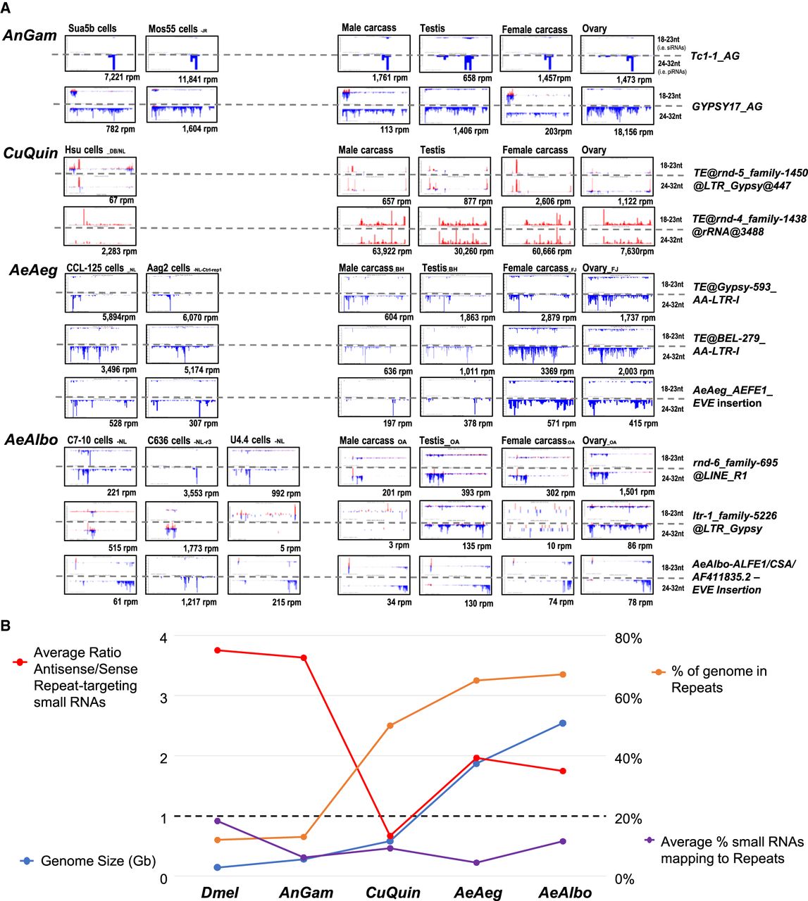 Transposons and repeats are targeted by common small RNAs in mosquito cells and tissues. (A) Profiles of the transposons and repeats with the most abundant small RNAs both in cell cultures and mosquito tissues. Positive strand reads are in red; minus-strand reads are in blue. The x-axis gives the coordinates of the transposon and repeats sequence; the y-axis is the autoscaled read frequency. The total small RNA normalized counts are below each plot. (B) Comparisons of Dipteran genome sizes, fraction of the genome as repeats, average percentage of the small RNAs targeting mosquito transposons and repeats, and the average ratios of the repeat-targeting small RNAs being antisense or the same sense as the repeats.