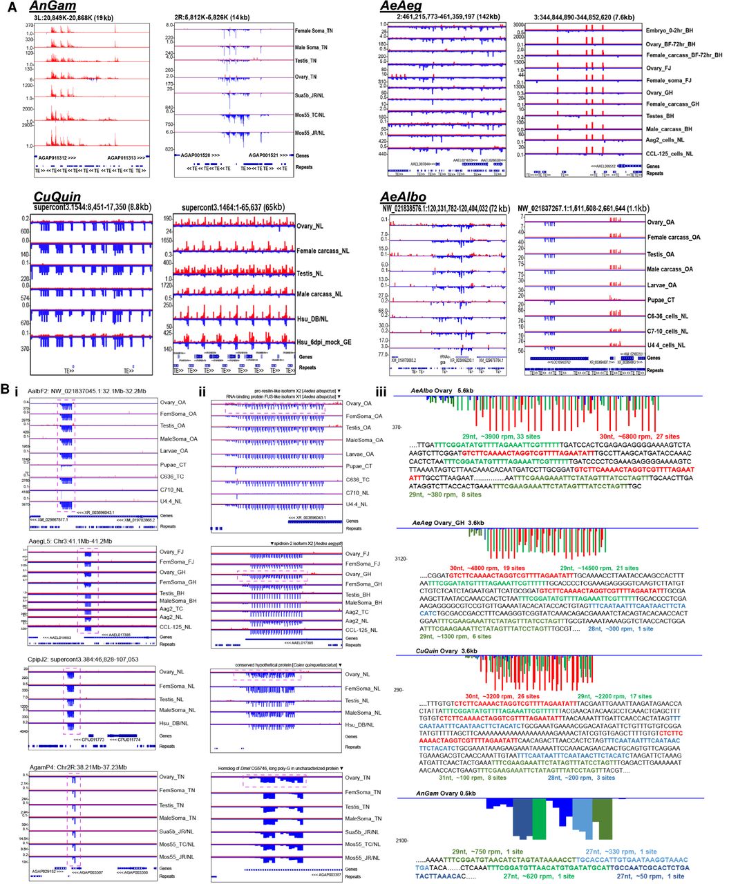 Prominent mosquito piRNA cluster loci. (A) Genome browser snapshots of notably large piRNA Cluster Loci (piRCL) in mosquitoes. Genes and repeats (TEs) tracks are at the bottom of each snapshot. (B) A dynamically evolving Mosquito-Conserved piRNA Cluster locus (MCpiRCL) expressed throughout gonads, soma, and cell cultures. (i) Zoomed out genome browser snapshots at the kilobase level of the MCpiRCL. (ii) Zoomed in view of the MCpiRCL from the dashed box in (i). The descriptions of the nearest transcript are listed at the top of the browser window. (iii) Microscopic view of the MCpiRCL from the dashed box in (ii). The peaks are color-coded according to the specific reads as DNA in the sequence below each diagram, derived from the region highlighted by the dashed box above the sequence. Reads per million (rpm) and how many occurrences of the read in the satellite tandem repeats within this MCpiRCL.