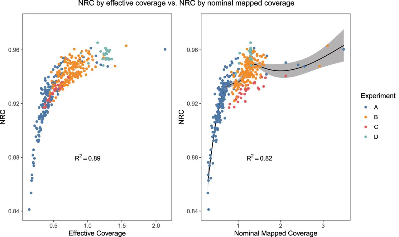 Nonreference concordance (NRC) (Methods) for imputed SNPs for all EUR samples in experiments A–D plotted against effective coverage λeff (left) or nominal mapped coverage (right). We modeled the NRC as the response variable for a k = 5 knot cubic restricted spline with the respective coverage metric as the explanatory variable; the fitted values are shown as a solid line with the surrounding shaded regions representing 95% confidence intervals. The knot locations were set at the 5th, 27.5th, 50th, 72.5th, and 95th percentiles of the respective coverage metrics following Harrell's rule of thumb (Harrell 2017).