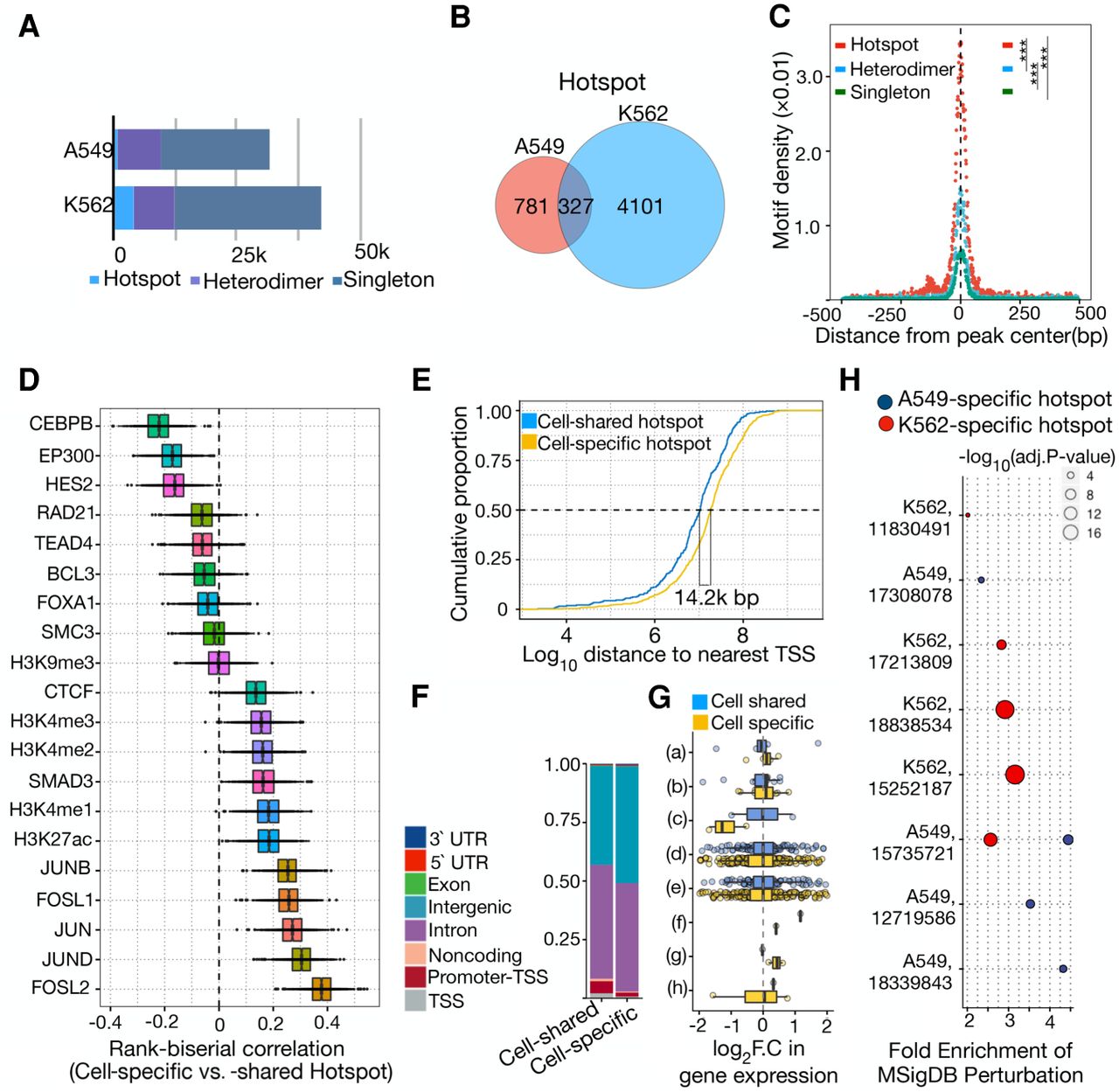 Distinct genomic and regulatory features of cell type–specific AP-1hotspots. (A) Bar plot showing the number of distinct AP-1 binding modes including AP-1 hotspots, AP-1 heterodimer, and singleton in A549 and K562 cells. (B) Venn diagram showing overlap between AP-1 hotspots in A549 and K562. (C) Sitepro plot showing the AP-1 motif per bp per peak for distinct AP-1 binding classes in K562 cells. P-values were calculated using a two-sided Student's t-test based on the normalized motif density within 1 kb of peaks. (***) P < 0.001. (D) Box plots showing the distribution of rank-correlation for TFs and histone marks between cell type–specific and –shared AP-1 hotspots. Each rank-correlation is based on the effect size for the Mann–Whitney U test between size- and number-matched bootstrapped replicates from cell type–specific and –shared AP-1 hotspots for binding activity of TFs. (E) Cumulative distribution of distance to nearest TSS for cell type–specific and –shared AP-1 hotspots. (F) Bar plot displaying the proportion of cell type–specific and –shared AP-1 hotspot loci by genomic annotation. (G) Bar plot showing the distribution of log2 fold change in gene expression in response to dex at a 12-h time point by genomic annotation for pre-established cell type–specific and –shared AP-1 hotspots. y-axis represents genomic annotations: (a) TSS, (b) Promoter-TSS, (c) Noncoding, (d) Intron, (e) Intergenic, (f) Exon, (g) 5′ UTR, and (h) 3′ UTR. (H) MSigDB Perturbation ontology enrichment using the genomic region-based binomial test for cell type–specific AP-1 hotspots in A549 and K562 cells. y-axis shows the cell type used in the perturbation study (Cell type, PubMed PMID for each data set). The color and size of dots represent the cell types and adjusted P-value, respectively.