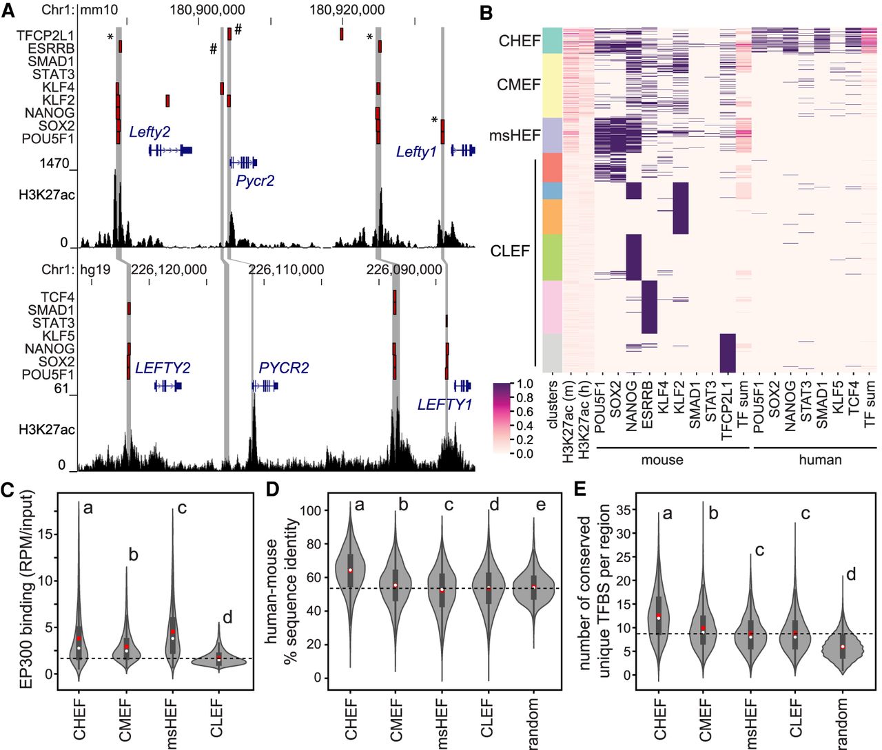 Conserved high enhancer feature (CHEF) regions contain a conserved regulatory code. (A) The Lefty1/Lefty2 locus in the mouse (top) and human (bottom) genomes. Transcription factor–bound regions from ChIP-seq (red bars), mouse and human syntenic regions (gray bars), and H3K27ac ChIP-seq data are displayed on the mm10 and hg19 assemblies of the University of California at Santa Cruz (UCSC) Genome Browser. * indicates regions with conserved binding of multiple transcription factors in mouse and human; # indicates regions with binding only in mouse ESCs. (B) Clustering of transcription factor–bound regions in mouse ESCs, using H3K27ac, transcription factor binding, and the number of transcription factors bound in a region (TF sum) at associated mouse and human regions. (C–E) Groups determined by one-way ANOVA to be significantly different (P < 0.05) are labeled with different letters; to indicate P > 0.05, groups are labeled with the same letter. In the violin plots, the white dot indicates the median; the red box indicates the mean; the dashed line indicates the mean for the CLEF cluster. (C) CHEF, CMEF, and msHEF regions display significantly increased EP300 association compared to CLEF regions. (D) CHEF regions display the highest overall percentage of sequence identity between mouse and human compared to other clusters and random regions not bound by transcription factors. (E) CHEF regions contain an increased number of unique TFBS sequences for ESC-expressed TFs compared to other clusters and random regions not bound by transcription factors. This was identified using MotEvo based on TFBS sequence conservation across six species.
