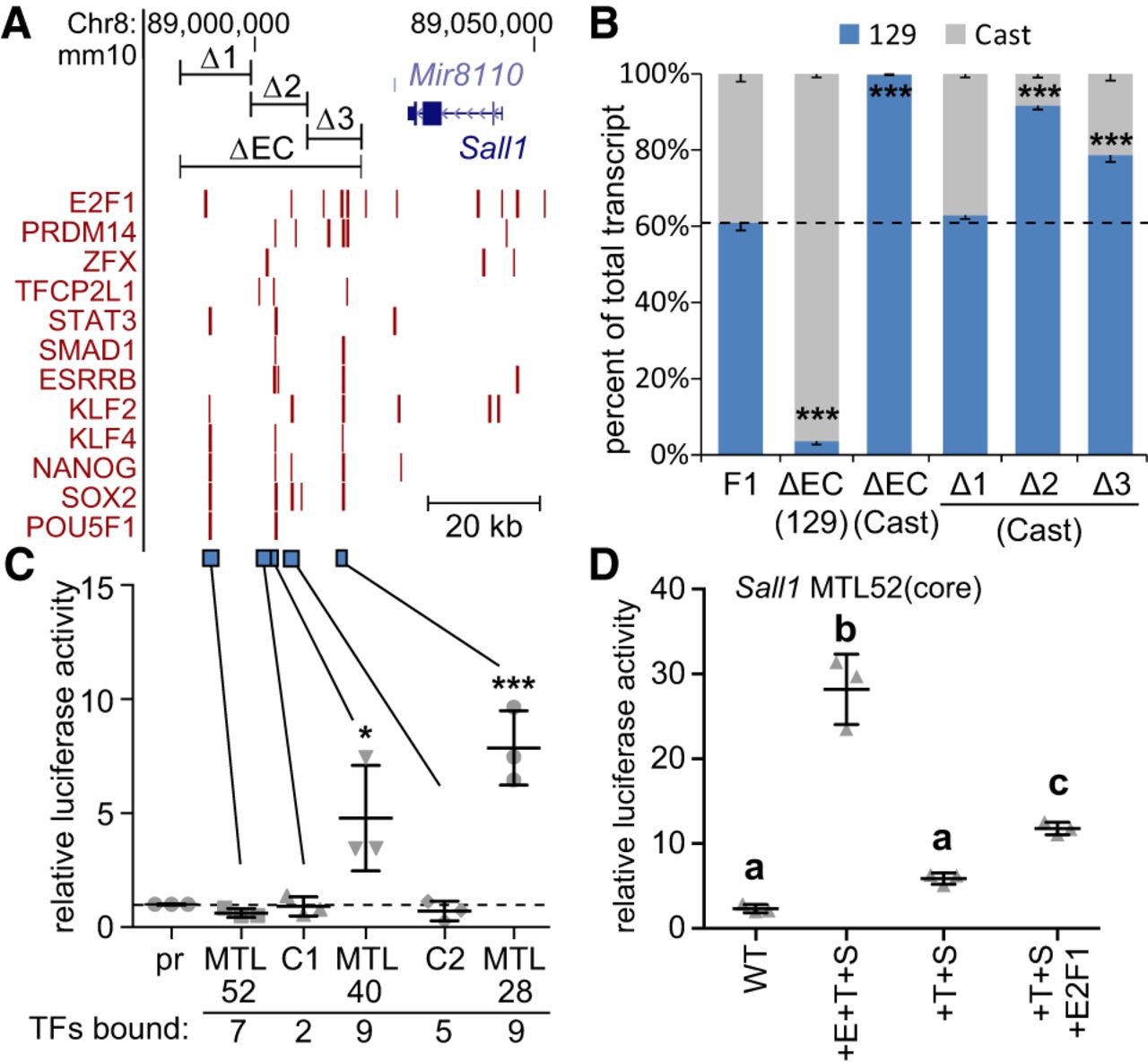 Addition of three different transcription factor binding sequences confers activity to an inactive region bound by six transcription factors. (A) Transcription factor–bound regions in the Sall1 locus from ChIP-seq (red bars) are displayed on the mm10 assembly of the UCSC Genome Browser. At the top, CRISPR deleted regions (ΔEC, Δ1, Δ2, Δ3) are displayed. At the bottom, regions tested for enhancer activity are displayed (blue bars). (B) Sall1 expression in wild-type F1 clones (F1) compared to clones with the indicated deletion. Allele-specific primers detect 129 or Cast RNA in RT-qPCR. Expression for each allele is shown relative to the total. Error bars represent SEM. n ≥ 3 biological replicates. (***) P < 0.001; significant differences from the F1 values. In C,D, error bars represent the standard deviation. n ≥ 3 biological replicates. (C) Luciferase activity at control (C1, C2) regions and multiple transcription factor–bound loci (MTL) 52, 40, and 28 kb downstream from Sall1. Significant differences from pr (promoter only) were determined by t-test and are indicated by (*) P < 0.05, (***) P < 0.001. (D) Luciferase activity for wild-type (WT) MTL52 core transcription factor–bound region, MTL52 core with ESRRB, TFCP2L1, and SMAD3 (+E+T+S) motifs mutated to the consensus TFBS sequence. From +E+T+S, ESRRB (+T+S) was removed. E2F1 was added to +T+S (+T+S+E2F1). Groups determined by one-way ANOVA to be significantly different (P < 0.05) are labeled with different letters.