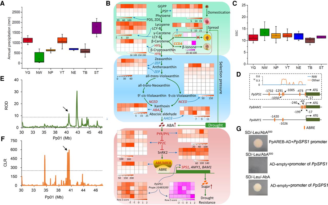 Genetic basis of drought resistance and high sugar content in the NW group. (A) Annual precipitation among geographic regions of the seven groups. (B) Relationship between the ABA pathway, drought stress, and evolution of flesh color. Heat maps in orange indicate gene expression levels (FPKM) under drought stress (0 h, 6 h, 12 h, 24 h, 3 d, 6 d, 12 d). Heat maps in pink indicate gene expression levels (FPKM) during peach fruit development (10, 50, and 90 d post-bloom date [dpb] for PpCCD4; 20, 40, 60, 80, 100, 120 dpb for PpSPS1). Genes under selection in the NW group are highlighted in red. Red arrows indicate the increase in levels of ABA and sugars. (C) Soluble solid content (SSC) among the seven groups. (D) ABRE cis-acting elements in the promoters of PpSPS1, PpBAM1, and PpAMY1. Orange boxes indicate ABRE elements in the promoter of each gene. The number around each ABRE represents the position from the ATG. The distribution of ABRE elements and nucleotide diversity (π) in the promoter of PpSPS1 in the NW and other groups are shown in a dashed box. (E) Distribution of ROD around PpSPS1 on Chromosome 1. Black arrow points to PpSPS1. (F) Distribution of CLR values around PpSPS1 on Chromosome 1. Black arrow points to PpSPS1. (G) Verification of the interaction between PpAREB (Prupe.1G434500) and the promoter of PpSPS1 (Prupe.1G483200) using a yeast one-hybrid assay.