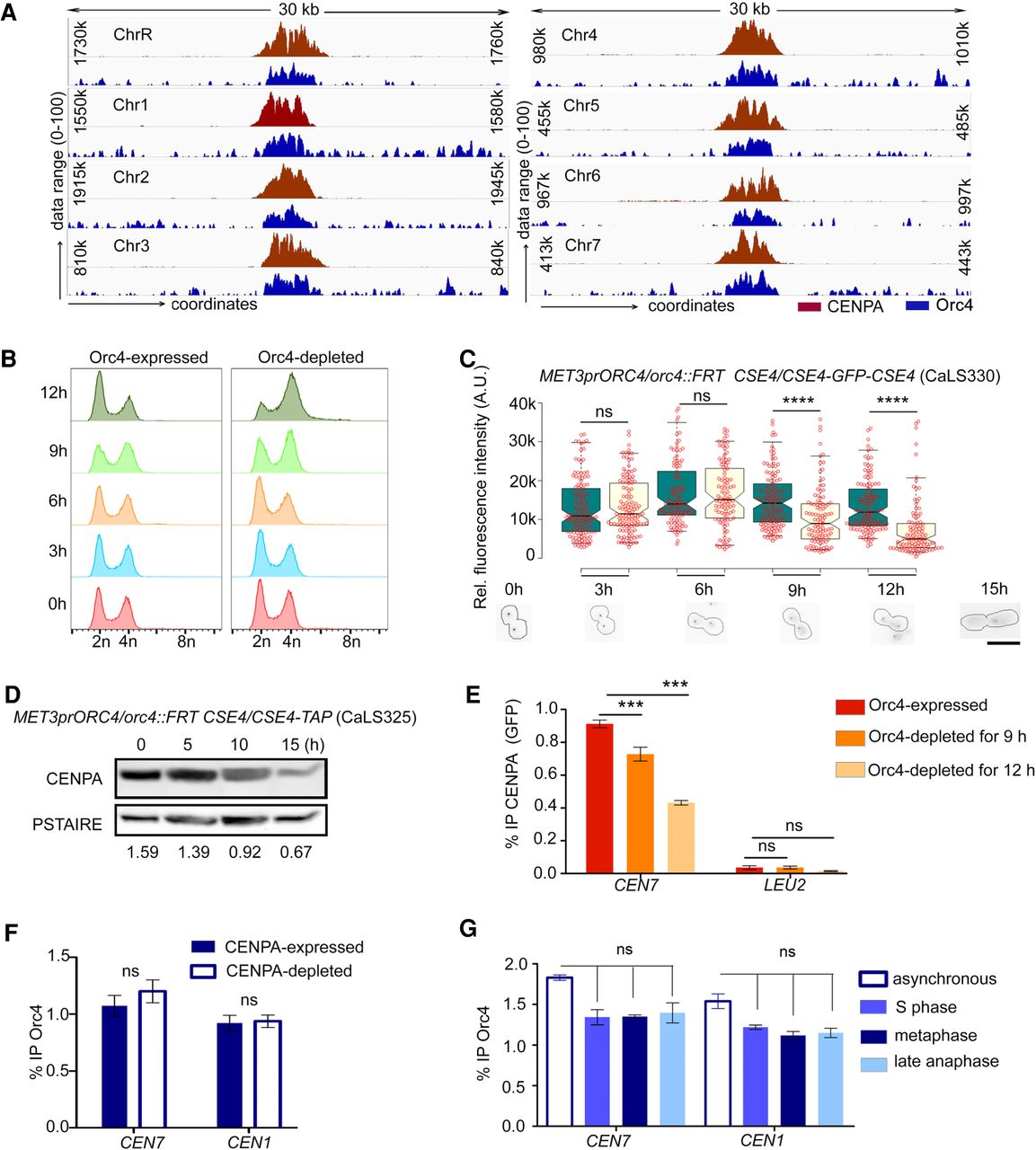 Centromeric localization of Orc4 stabilizes CENPA. (A) A 30-kb region harboring each centromere (x-axis) was plotted against the subtracted ChIP sequencing reads (y-axis) for CENPA (red) and Orc4 (blue). (B) Flow cytometric analyses of orc4 mutants in Orc4-expressed versus Orc4-depleted conditions at the indicated time of incubation. (C) Relative fluorescence intensities of CENPA (GFP) clusters in orc4 mutant CaLS330 grown at indicated time points in permissive (green) and nonpermissive (yellow) conditions show a significant reduction of GFP upon depletion of Orc4. Scale bar, 10 µm. t-test; (****) P-value < 0.0001, (ns) P-value > 0.05; n ≥ 100. (D) Western blot of the whole-cell lysate of CaLS325 (METprORC4/orc4::FRT CSE4/CSE4-TAP) using anti–Protein A antibodies showed a time-dependent decrease in CENPA levels upon Orc4 depletion when normalized with the loading control, PSTAIRE. (E) ChIP-qPCR using anti-GFP (CENP-A) antibodies revealed reduced CENPA enrichment at the centromere upon Orc4 depletion in CaLS330 when grown in nonpermissive media for 9 and 12 h. Two-way ANOVA; (***) P-value < 0.001; (ns) P-value > 0.05; n = 3. (F) Orc4 ChIP-qPCR revealed no significant reduction in centromeric Orc4 when CENPA was depleted for 8 h in YP with dextrose in the strain CAKS3b (cse4/PCK1prCSE4) (Sanyal and Carbon 2002). Two-way ANOVA; (ns) P-value > 0.05; n = 3. (G) ChIP-qPCR revealed the Orc4 enrichment at CEN7 in various stages of the cell cycle: hydroxyurea treated (S phase), nocodazole treated (metaphase), cdc15 mutant (late anaphase). Percentage IP values for Orc4 ChIP at CEN7 were normalized with noncentromeric regions enriched with Orc4. One-way ANOVA; (***) P-value < 0.001; (ns) P-value > 0.05; n = 3.