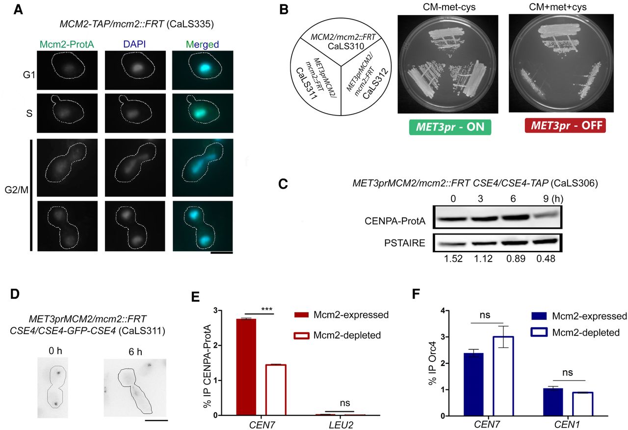 Mcm2 is essential for cell viability and CENPA stability in C. albicans. (A) Intracellular localization of Mcm2–Protein A in CaLS335 (MCM2-TAP/mcm2::FRT) cells stained with anti–Protein A antibodies and DAPI. Scale bar, 5 µm. (B) CaLS310 (MCM2/mcm2::FRT), where one copy of MCM2 was deleted, and two independent transformants, CaLS311 and CaLS312 (MET3prMCM2/mcm2::FRT), where the remaining wild-type copy was placed under the control of the MET3 promoter, were streaked on plates containing permissive (CM-met-cys) and nonpermissive (CM + 5 mM cys + 5 mM met) media and photographed after 48 h of incubation at 30°C. (C) Western blot of the whole-cell lysate of CaLS306 (MET3prMCM2/mcm2::FRT CSE4/CSE4-TAP) using anti–Protein A antibodies revealed a time-dependent decrease in CENPA levels upon depletion of Mcm2 for 3, 6, and 9 h. Normalization was performed using PSTAIRE. (D) CENPA (GFP) cluster delocalizes upon depletion of Mcm2 in CaLS311 (MET3prMCM2/mcm2::FRT CSE4-GFP-CSE4/CSE4). Scale bar, 5 µm. n = 100. (E) ChIP-qPCR using anti–Protein A antibodies revealed a significant reduction of CENPA at CEN7 in CaLS306 when grown in nonpermissive media for 6 h. Two-way ANOVA; (***) P-value < 0.001; (ns) P-value > 0.05; n = 3. (F) ChIP-qPCR in CaLS311 revealed no significant difference in the Orc4 enrichment at the centromeres in the presence or absence of Mcm2. Two-way ANOVA; (***) P-value < 0.001; (ns) P-value > 0.05; n = 3.