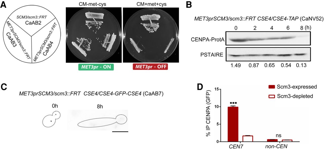 Scm3 is essential for stability of CENPA in C. albicans. (A) The C. albicans strain CaAB2 (SCM3/scm3::FRT), where one copy of SCM3 has been deleted, and two independent transformants CaAB3 and CaAB4 (MET3prSCM3/scm3::FRT), where the remaining allele was placed under the control of the MET3 promoter, were streaked on plates containing permissive (CM-met-cys) and nonpermissive (CM + 1 mM met + 1 mM cys) media and photographed after 48 h of incubation at 30°C. (B) Western blot showing protein levels of CENPA upon depletion of Scm3 for the indicated time points normalized to PSTAIRE. (C) Dissociation of the CENPA (GFP) cluster marking disintegration of the kinetochore in CaAB7 (MET3prSCM3/scm3::FRT CSE4-GFP-CSE4/CSE4) cells grown in nonpermissive conditions for the indicated time. Scale bar, 5 µm. n = 100. (D) ChIP-qPCR using anti-GFP (CENPA) antibodies revealed reduced CENPA enrichment at CEN7 in CaAB7 when grown in nonpermissive media for 8 h. Two-way ANOVA; (***) P-value < 0.001; (ns) P-value > 0.05; n = 3.