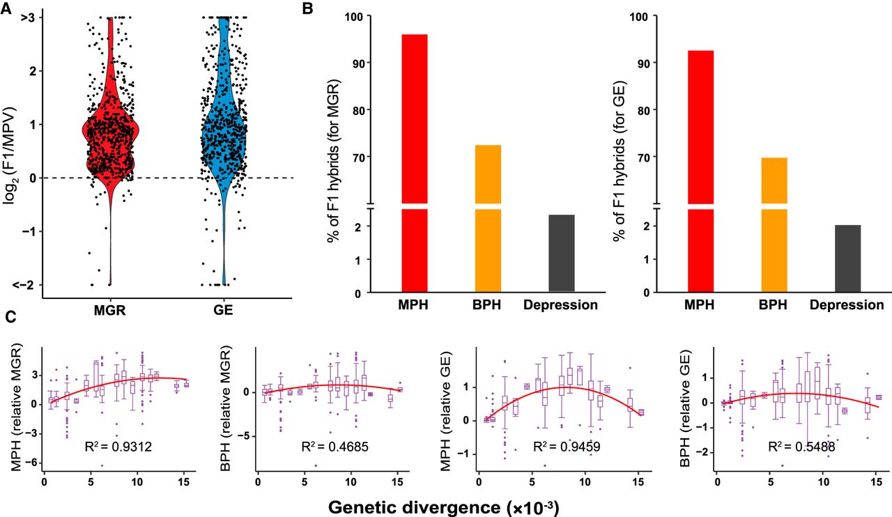 Heterosis of F1 hybrids of wild S. cerevisiae, and correlation between heterosis and the genetic distance of parental strains at 40°C. (A) Maximum growth rate (MGR) and growth efficiency (GE) of F1 hybrids relative to the average values of their parents (mid-parent value [MPV]). (B) Proportions of F1 hybrids showing mid-parent heterosis (MPH), better-parent heterosis (BPH), and outbreeding depression. (C) Correlation between genetic distances of parental strains and growth performance of F1 hybrids relative to the MPV (MPH) or the better parent value (BPH) in terms of MGR or GE.