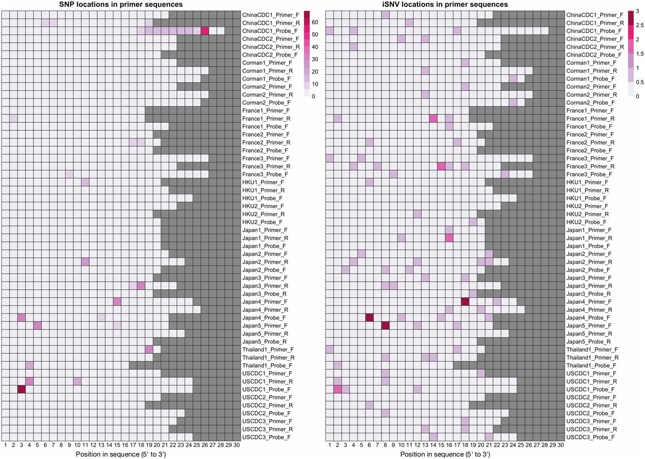 iSNV and SNP presence on widely used primers and probes. This figure shows the locations on WHO probes and primers that contain SNPs (left) and iSNVs (right). Columns correspond to base pair positions within the probe, and the sequences are 5′-aligned. Rows correspond to the oligonucleotide sequences, and squares are highlighted based on how many samples/genomes contain a variant in that position.