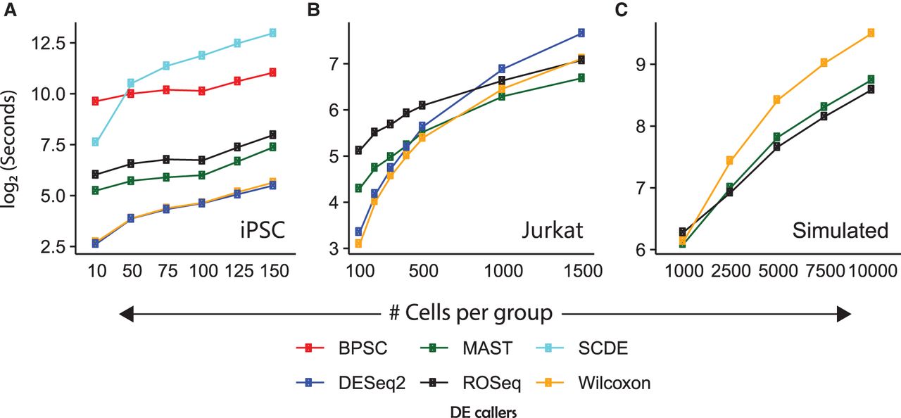 Tracking execution time on scRNA-seq data of varied sizes. (A) Line chart showing median time taken by each algorithm on 100 randomly sampled null data sets containing iPSC transcriptomes (replicate id: NA19098). (B) Line chart showing median time taken by each algorithm on 20 randomly sampled null data sets containing Jurkat transcriptomes. (C) Line chart showing median time taken by each algorithm on 20 randomly sampled null data sets using the Splatter R package (Zappia et al. 2017). Note that for the iPSC data, we used a single CPU core; for the remaining larger data sets, we used four cores of the workstation.