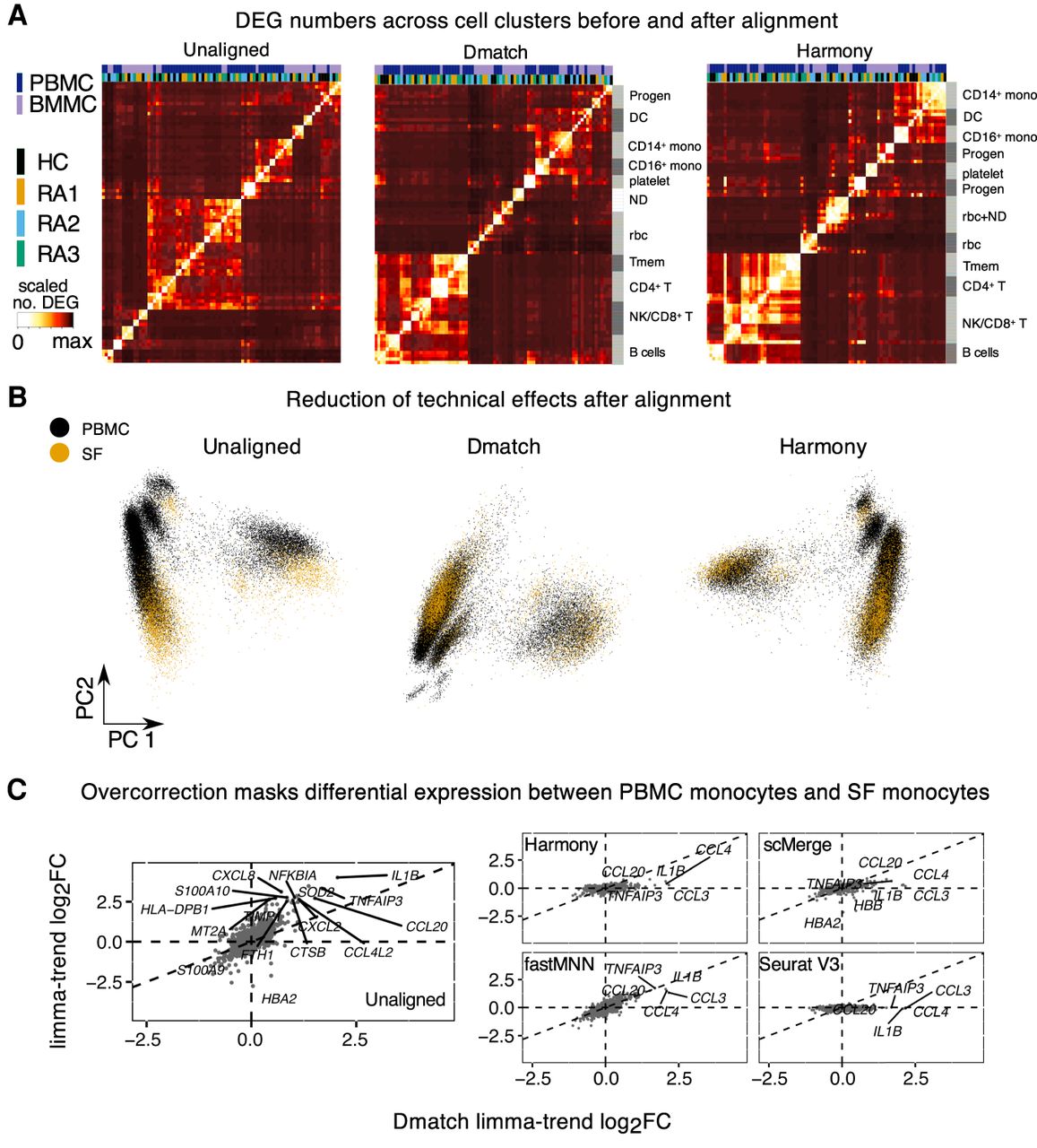 Cross-biopsy alignments between PBMC and SF immune cells. (A) Heat maps showing the number of DEGs identified (Methods) across Seurat clusters in PBMC and BMMC samples using unaligned data, Dmatch-aligned data, and Harmony-aligned data (others in Supplemental Fig. S12). Improvement of clustering by cell type using aligned data indicates removal of batch effects from unaligned data. (ND) Not determined. (B) PCA of scRNA-seq samples from PBMC and SF before alignment and after alignment using Dmatch and Harmony. Although unaligned data show likely batch effects specific to biopsy site, this effect is reduced after alignment. (C) Scatterplots of estimated gene expression log fold changes between CD14+ monocytes from RA2 PBMC and RA2 synovial fluid (SF). We found that only Dmatch- and fastMNN-aligned data reflected overexpression of pro-inflammatory genes in RA2 SF versus PBMC monocytes.