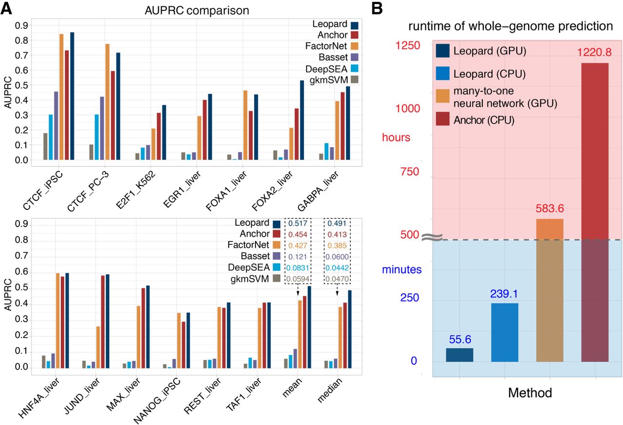 Leopard substantially improves TF binding site prediction over state-of-the-art methods. (A) Leopard was benchmarked with the top performing classical tree-based model (Anchor), the top performing neural network model (FactorNet) in the ENCODE-DREAM in vivo TF binding site prediction challenge, two recent deep learning approaches (DeepSEA and Basset), and a classical machine learning method (gkmSVM). The same challenge training and testing data sets were used to train models and evaluate performance. Overall, Leopard achieved higher prediction AUPRCs than did the other methods. The mean and median AUPRCs on the bottom right clearly show the advantage of Leopard predictions in the 13 testing TF–cell type pairs. Leopard substantially improved the median prediction AUPRC by 19% and 27% over Anchor and FactorNet, respectively. (B) The runtime was tested for predicting the HNF4A binding profiles in the liver cell using different methods. Leopard shows a great advantage of speed and is flexible with both GPU and CPU.