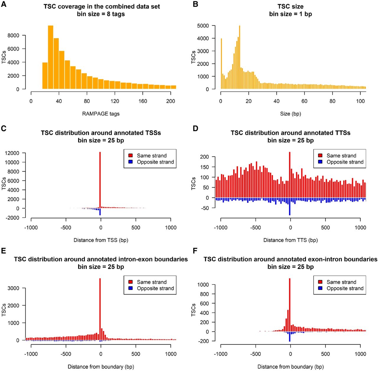 Identification of promoters by RAMPAGE. (A) Tag coverage in TSCs identified in the combined data set. (B) TSC size distribution for the whole data set. (C) Histogram of the distance between TSCs and their nearest annotated TSS. (D) Histogram of the distance between TSC and the nearest annotated TTS. (E) Histogram of the distance between TSCs and intron–exon boundaries. Only intron–exon boundaries not overlapping with any annotated TSSs were considered. (F) Histogram of the distance between TSCs and exon–intron boundaries. For visualization, exon–intron boundaries corresponding to the end of the first exon were ignored, as TSCs tended to group immediately upstream of these boundaries and interfere with the visualization.