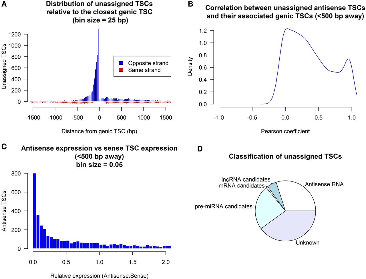 Identification of unassigned TSCs through bioinformatic approaches. (A) Distance between unassigned TSCs and their nearest genic TSCs. A high number of elements localized within 500 bp upstream of genic TSCs but on the opposite strand. (B) Correlation of expression from antisense TSCs (CPM > 3) with expression from sense TSCs. (C) Expression of the antisense variant (CPM > 3) relative to the sense variant. (D) Putative roles attributed to unassigned TSCs.