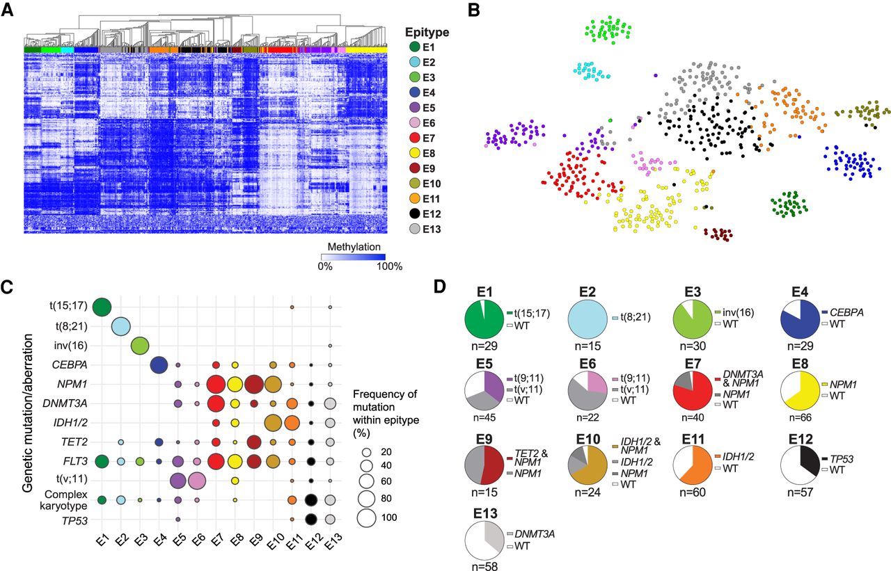 Unsupervised clustering of 649 AML samples using DNA methylation and relationship with genetic mutations. (A) Heatmap of the 500 most variable CpGs across all samples organized by hierarchical clustering. Samples are annotated by epitype assignment using PAM clustering (colors). (B) The same 500 most variable displayed by t-SNE plot. (C) The distribution of the most common recurrent genetic aberrations in AML within the epitypes. Bubble size represents the percentage of patients within the epitype with the corresponding aberration. (D) Pie charts displaying the frequency of the most common (dominant mutation/combination) within each epitype.