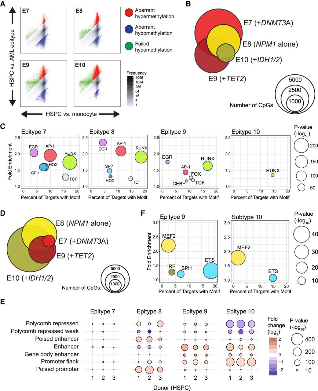 Analysis of tumor-specific methylation in the NPM1 constellation of epitypes (E7–E10). (A) Scatterplots comparing normal and tumor developmental methylation changes in E7–E10 highlight differential degrees of failed hypomethylation (green), aberrant hypermethylation (red), or aberrant hypomethylation (blue). (B) Venn diagram illustrating the numbers and overlap of aberrantly hypomethylated CpGs in E7–E10, with the dominant mutations within each epitype indicated (NPM1 alone or NPM1 plus a modifier mutation). (C) Bubble scatterplot of transcription factor motif enrichment in regions aberrantly hypomethylated in E7–E10. Bubble size corresponds to the P-value and color corresponds to transcription factor family. (D) Venn diagram of the aberrant hypermethylation in epitypes E7–E10. (E) Enrichment of aberrantly hypermethylated regions in selected chromatin states defined using the 15-state ChromHMM model in three independent HSPC samples. (F) Bubble scatterplot of transcription factor motif enrichment in regions aberrantly hypermethylated in epitypes 9 and 10.