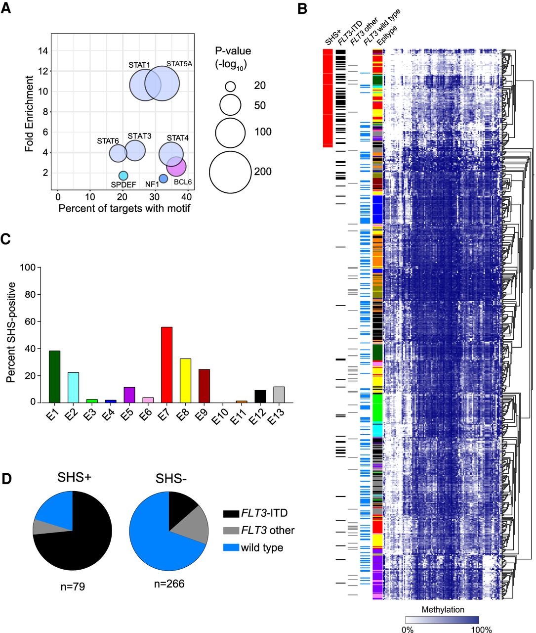 A hypomethylation signature involving STAT is associated with FLT3-ITD mutations. (A) Bubble scatterplot of transcription factor motif enrichment in hypomethylated regions in FLT3-ITD-mutated AMLs. Bubble size corresponds to the P-value, and color corresponds to transcription factor family. (B) Heatmap of the STAT hypomethylation signature with samples arranged by hierarchical clustering. (C) Distribution of STAT hypomethylation signature-positive (SHS+) samples across AML epitypes. (D) Breakdown of FLT3 mutations in SHS+ (left) and SHS− (right) groups.