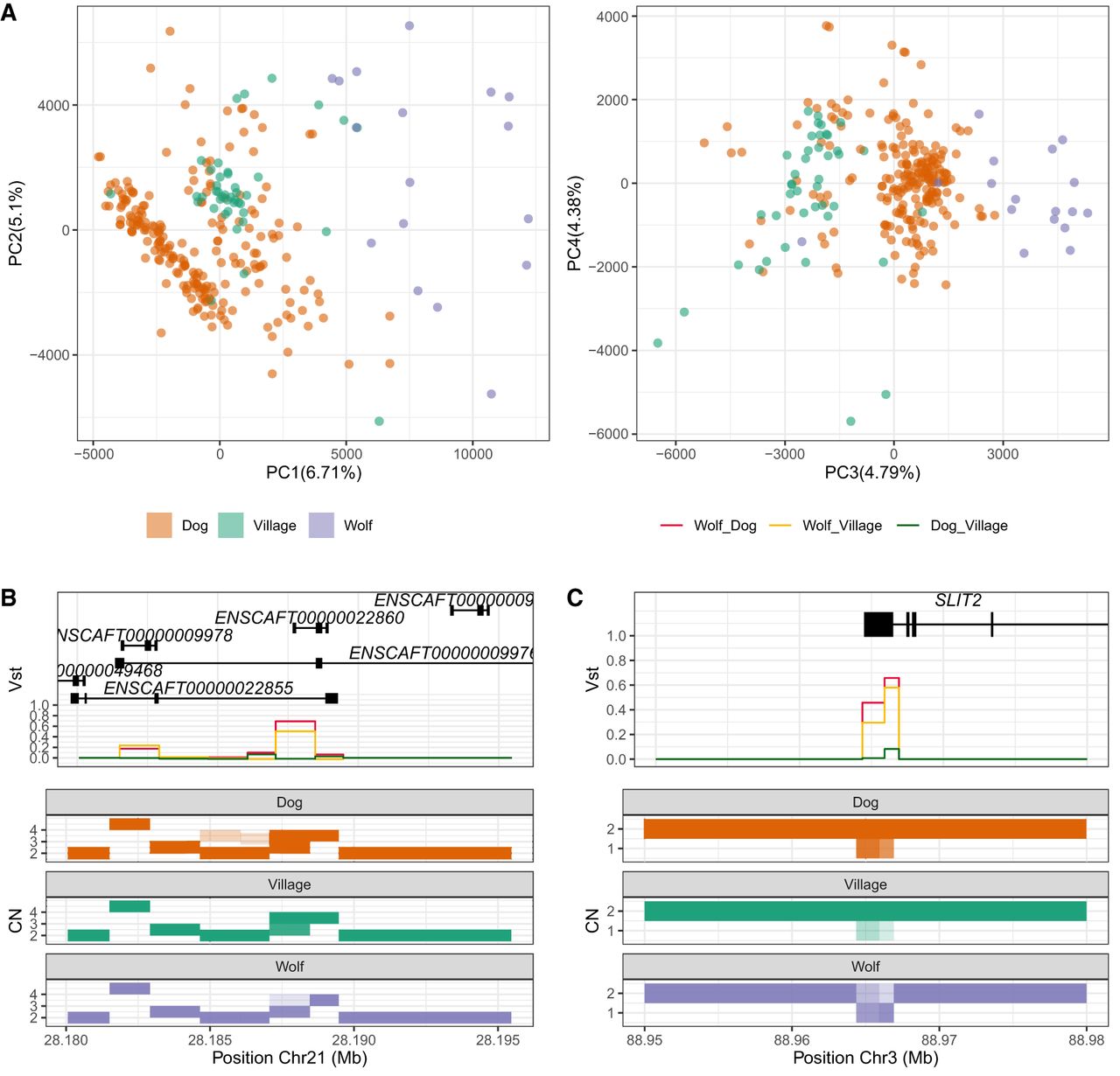 Global and specific differences in CN between breed dogs, village dogs, and wolves. (A) Copy number-based principal component analysis of breed dogs (orange), village dogs (green), and wolves (purple). (B,C) Depictions of the copy number values for two highly differentiated loci: the HBB chain gene cluster (ENSCAFT00000009978, ENSCAFT00000022860, ENSCAFT00000009984) and SLIT2. Discrete copy number values for all samples are depicted in rectangle plots. Purple: wolves, green: village dogs, orange: modern dogs. Top panel: VST values for the same genomic windows; bottom panel: copy number window values.