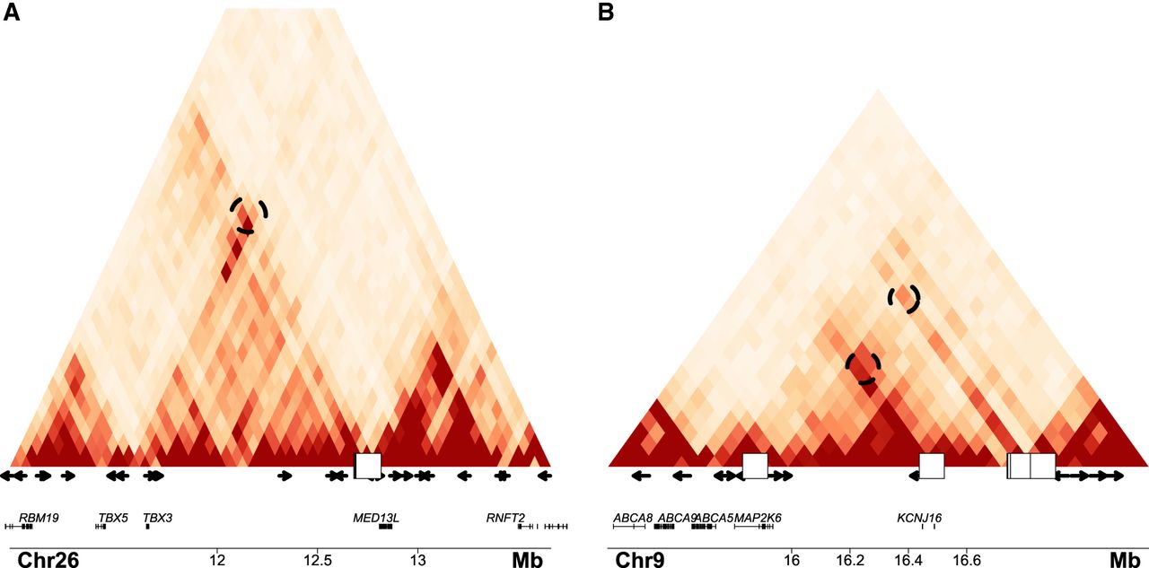 Instances of CNVs associated with phenotypes overlapping chromatin contacts. (A,B) Hi-C interaction heat maps for significant contacts on Chromosomes 26 and 9. The white squares on the x-axis mark the position the GWAS hits. The arrows mark the position and directionality of the most significant CTCF motifs of the area. The dashed circles within the Hi-C plot mark the significant interactions involving the relevant genes and the associated CNVs.