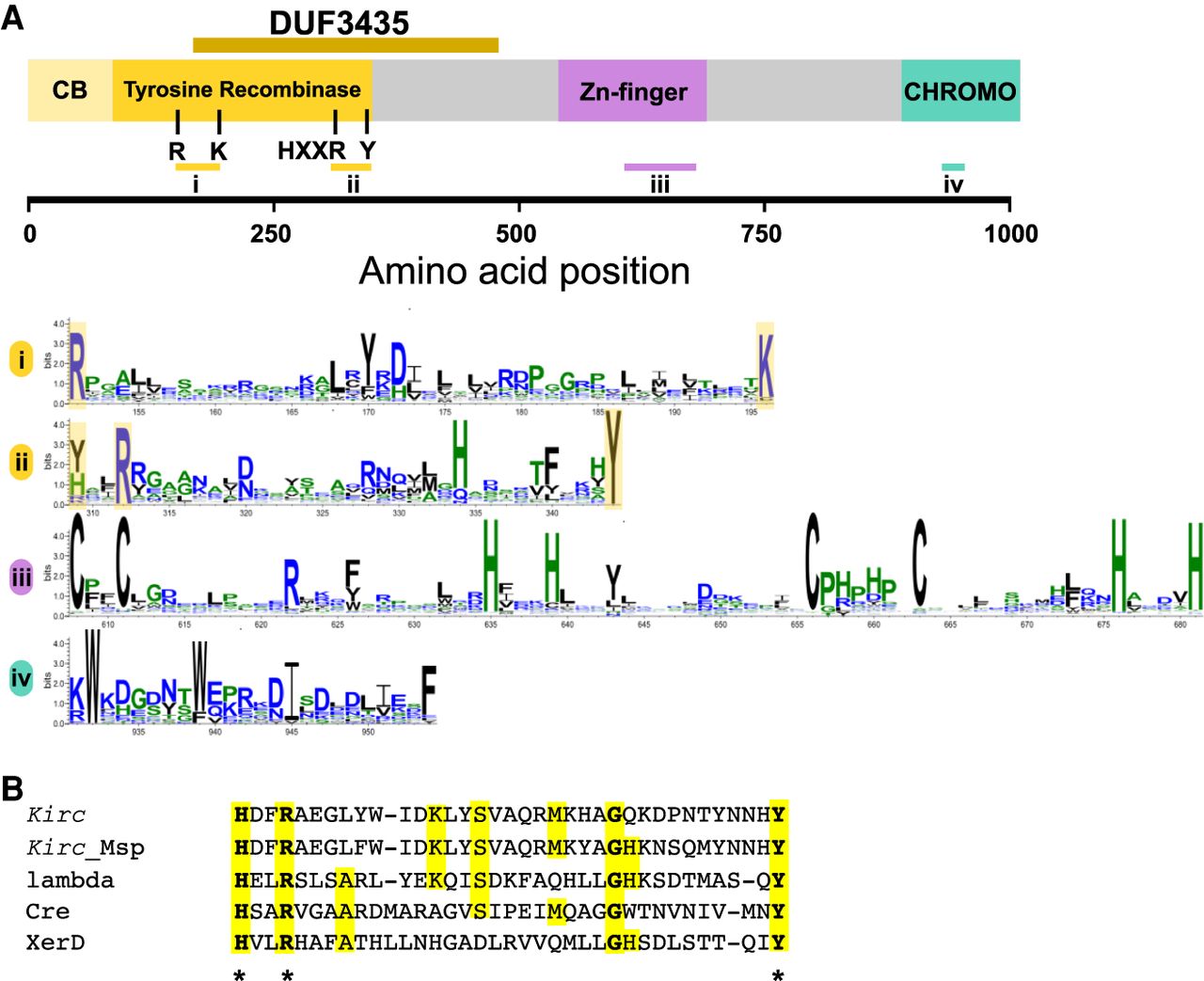 Molecular characterization of Kirc. (A) Domain annotation of the Kirc protein obtained using HHPred. Four domains were identified: an N-terminal tyrosine recombinase domain with the associated core-binding domain, a central Zn-finger domain, and a C-terminal chromodomain. An alignment of 279 Kirc homologs generated by Gremlin with HHBlits was used to create sequence logo of relevant regions of the Kirc sequences, including the active site regions of the tyrosine recombinase domain (i and ii), the Zn-finger region (iii), and the chromodomain region (iv) using WebLogo. Residues corresponding to the catalytic pentad of the tyrosine recombinase are highlighted in yellow. (B) Alignment of the Kirc sequence with an active site region of known tyrosine recombinases together with the sequence of a Kirc homolog from Melanconium sp. strain NRRL 54901. Alignment is based on the HHPred output. Active site residues are marked with an asterisk. (Kirc) Kirc gene in the Spok block of strain Wa58 (sites 309–344), (Kirc_Msp) CE55503_10527 (110–145), (lambda) lambda integrase PDB: 5J0N (308–342), (Cre) recombinase enterobacteriaphage P1, PDB: 1XO0 (270–305), (XerD) XerD site-specific recombinase E. coli, PDB: 1A0P (242–277).