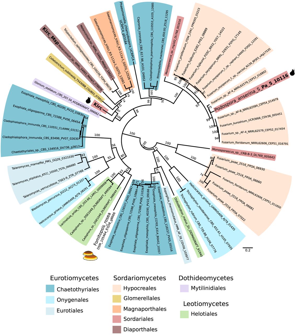 Unrooted maximum likelihood phylogenetic tree showing the relationship between Kirc, the homolog from Melanconium sp., and other homologs from fungi. Bootstrap support values are shown above branches. Branch lengths are proportional to the scale bar (amino acid substitution per site). Taxonomic rank is indicated with colored highlights. The sequences present in Podospora anserina and in the basidiomycete Fomitopsis rosea are marked with cartoons of the corresponding fruiting bodies. Nomenclature is formatted as species_strain_protein code.