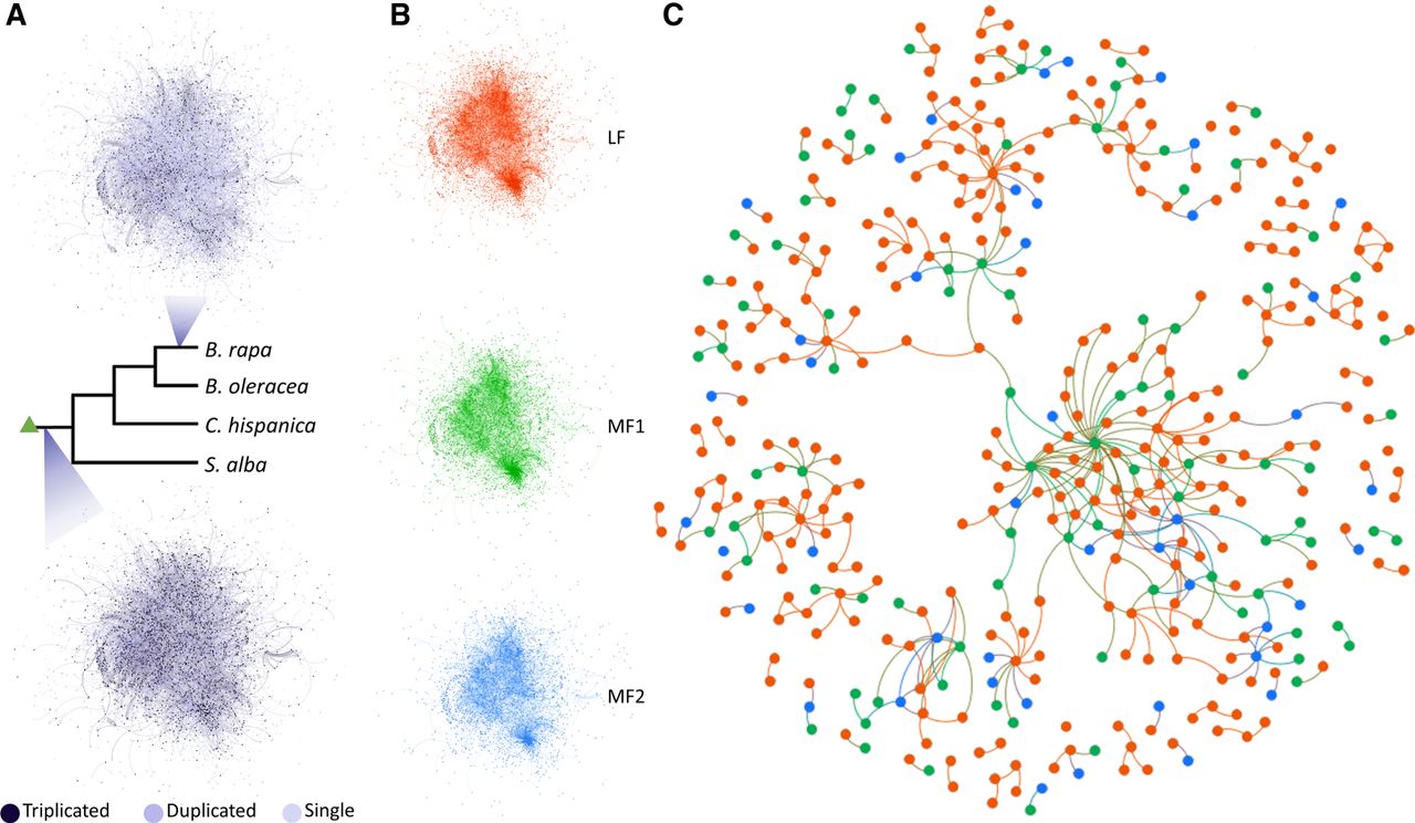 Protein–protein interaction networks after the WGT. (A) The Arabidopsis PPI network at the root branch (bottom), and the same PPI network colored by the Brassica rapa gene retention status (top). The dark purple nodes represent retained triplets (Supplemental Code). (B) The PPI network partitioned by subgenome assignment at the root branch: (LF) red, 4249 nodes and 8454 edges; (MF1) green, 3379 nodes and 6442 edges; (MF2) blue, 3073 nodes and 4961 edges. (C) A subset of the PPI network where only nodes encoded by single copies genes and connected to other single-copy nodes are shown. Red nodes are from the LF subgenome, green nodes are from the MF1 subgenome, and blue nodes are from the MF2 subgenome.