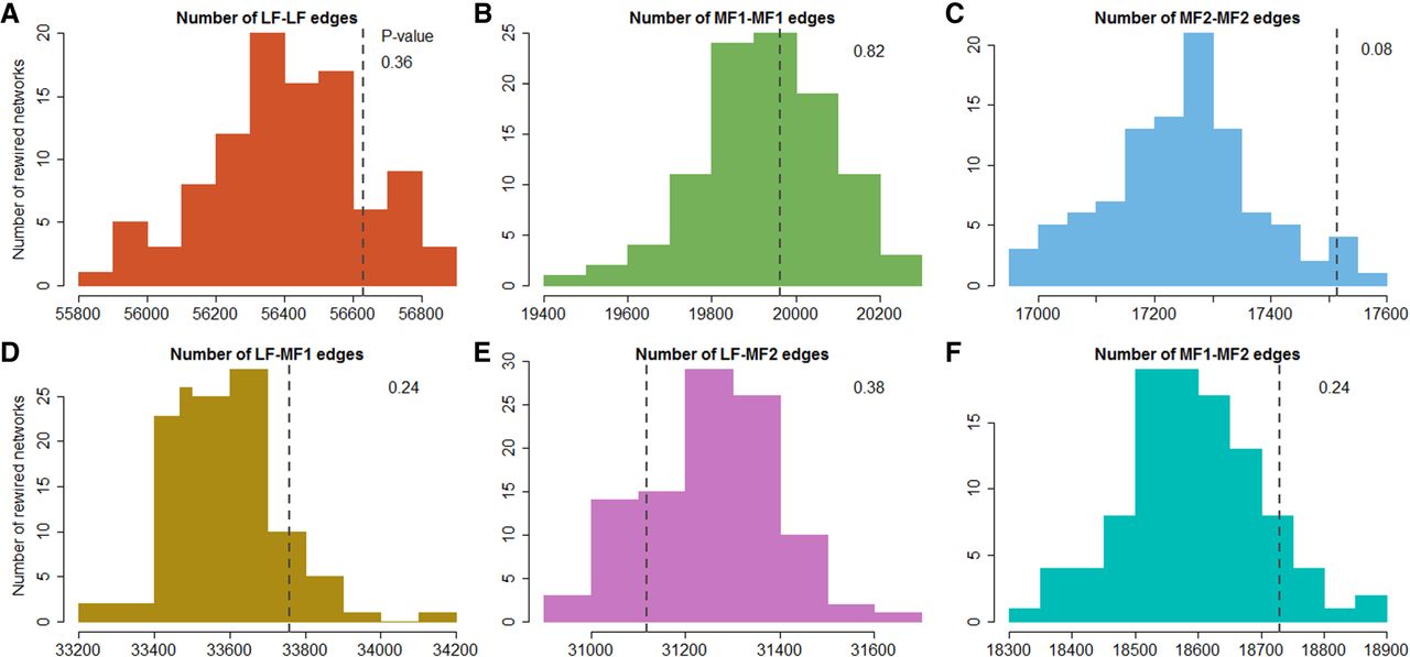 Subgenome-specific edge counts for 100 rewired Brassica rapa coexpression networks compared to those from the actual network. (A) Distribution of the number of edges connecting pairs of B. rapa genes from the LF subgenome in 100 rewired networks. (B) Distribution of the number of edges connecting pairs of genes from the MF1 subgenome. (C) Distribution of the number of edges connecting pairs of genes from the MF2 subgenome. (D) Distribution of the number of edges connecting LF genes to MF1 genes. (E) Distribution of the number of edges connecting LF genes to MF2 genes. (F) Distribution of the number of edges connecting MF1 and MF2 genes. In each panel, the dark gray dashed line shows the number of edges with that set of subgenome assignments for the true network. See Supplemental Code.