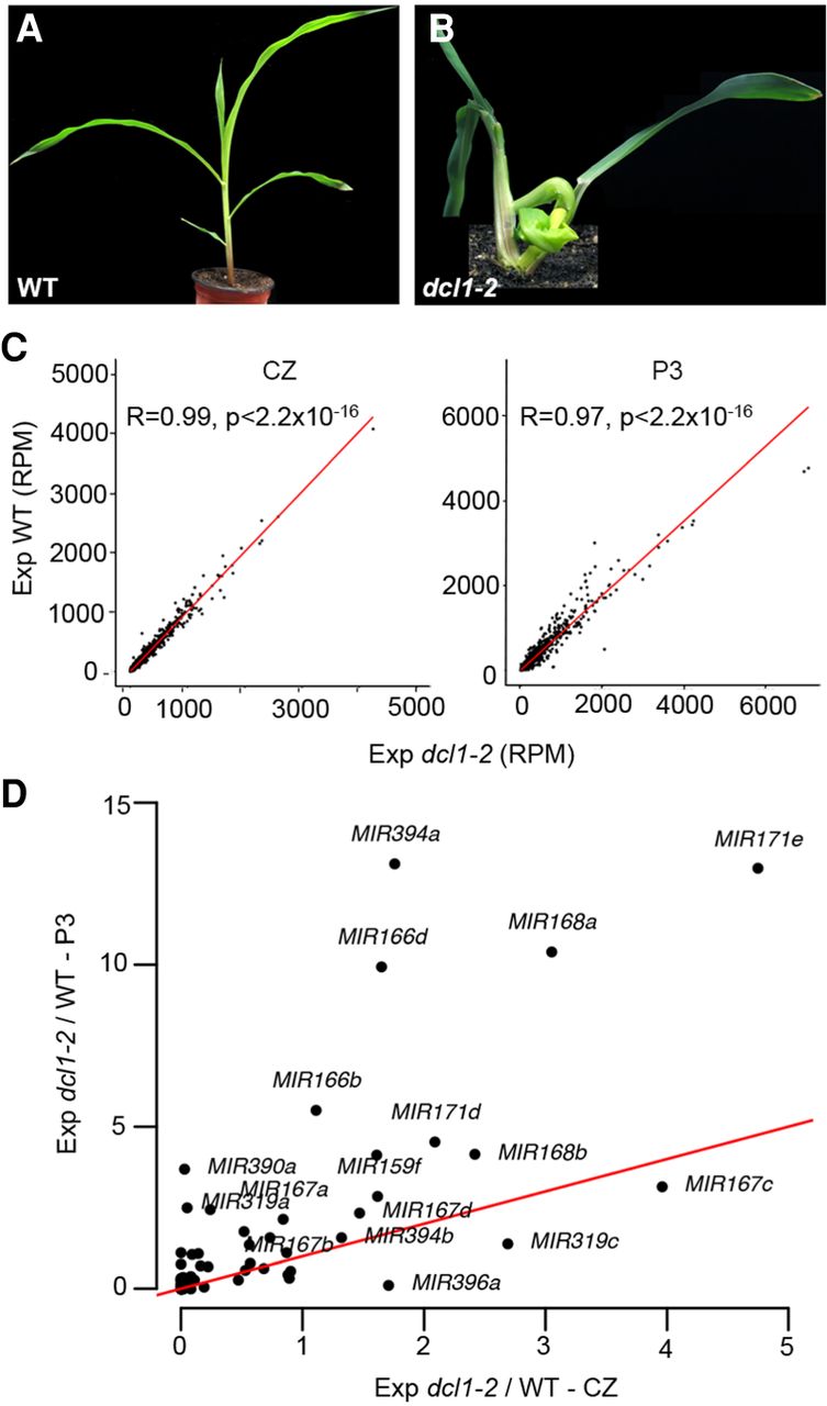 miRNA accumulation within the meristem central zone is suppressed post-transcriptionally by tuning processing efficiency. (A,B) Compared with the wild type (A), 2-wk-old dcl1-2 (B) seedlings show a weak phenotype typified by a compact stature and tightly curled leaves. (C) Global gene expression profiles for the CZ (left) and P3 primordia (right) in dcl1-2 and wild type are highly significantly correlated (r = 0.99 and r = 0.97, respectively). (D) The effect of dcl1-2 on precursor levels is far more pronounced in P3 primordia than in the CZ. The red line indicates an equal dcl1-2/WT expression ratio in the two tissues. Incidents above the red line indicate precursors with higher processing efficacy in P3 primordia.