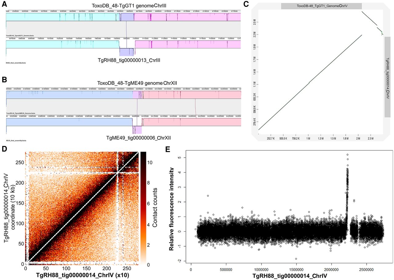 Long-read assembly reveals previously unknown inversions and the centromere location on Chr IV in T. gondii. (A) Inversion in the RH88 long-read assembly on Chromosome III relative to the ToxoDB-48_TgGT1 assembly. (B) Inversion in the ME49 long-read assembly on Chromosome XII relative to the ToxoDB-44_TgME49 genome. (C) Dot plot comparison of the TgRH88 long-read assembly and the ToxoDB-48_TgGT1 genome showing a 429.3-kb inversion at 2,096,529–2,525,795 bp on Chr IV. (D) Intra-chromosomal Hi-C contact-count heat map plotted using the sequence of tig00000014 in TgRH88 long-read assembly showing a clear centromere signal at position 2.2–2.3 Mb. (E) ChIP-on-chip signal of centromeric histone 3 variant (CenH3) (Brooks et al. 2011) plotted using the TgRH88 long-read assembly as coordinate.
