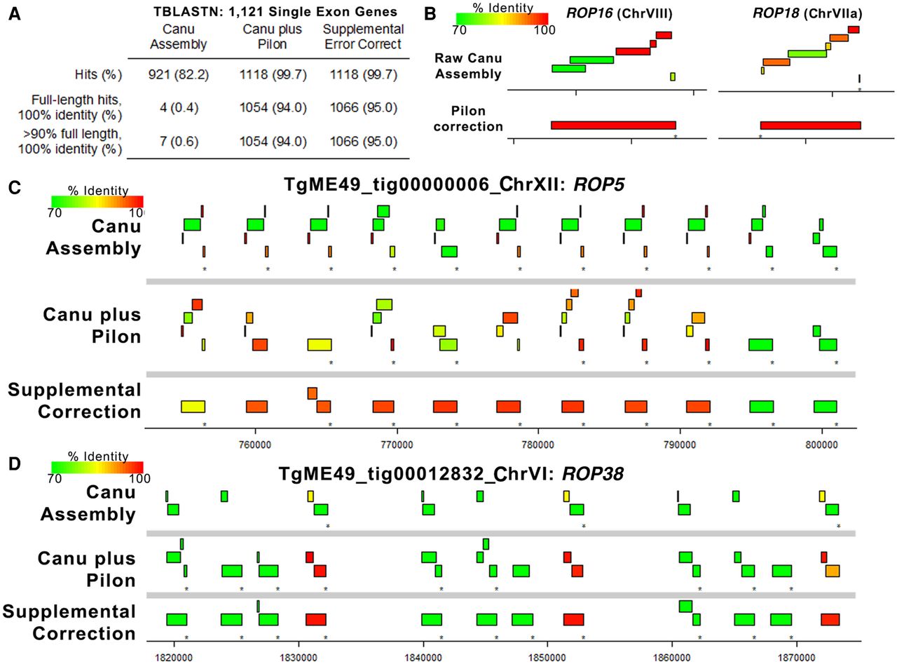 Error polishing with Pilon is effective for most single-copy genes, but resolution of tandem gene expansion errors requires supplemental correction. (A) We identified 1121 single-exon genes with predicted proteins that mapped with 100% identity and 100% coverage using TBLASTN against the ToxoDB-48 ME49 genome. Then, we mapped these against the raw assembly generated by Canu, the polished assembly generated by four rounds of Pilon, and after four rounds of supplemental error correction. Pilon error correction was sufficient for perfect mapping of 94% of the query single-exon genes (compared with only 0.4% for the raw Canu assembly), and supplemental error correction only increased this mapping percentage slightly. (B) Plots representing TBLASTN analysis of protein sequences from two single-copy genes showing the improved mapping achieved by Pilon-based error correction. Mapping identity is indicated by the color of the box representing the alignment. (C,D) Plots representing protein-coding sequences from the ROP5 (C) or ROP38 (D) gene mapped using TBLASTN against the raw Canu-only assembly, the Pilon-corrected assembly, and the region corrected using our supplemental approach tailored to tandem gene arrays. Both loci have multiple pseudogenes in the Canu-only and Canu-plus Pilon assemblies, but many of these errors are removed upon supplemental correction. The presence of a pseudogene in the ME49 ROP5 locus has been predicted before based on direct sequencing, suggesting that this may represent the most accurate version of the ME49 ROP5 locus sequenced to date.