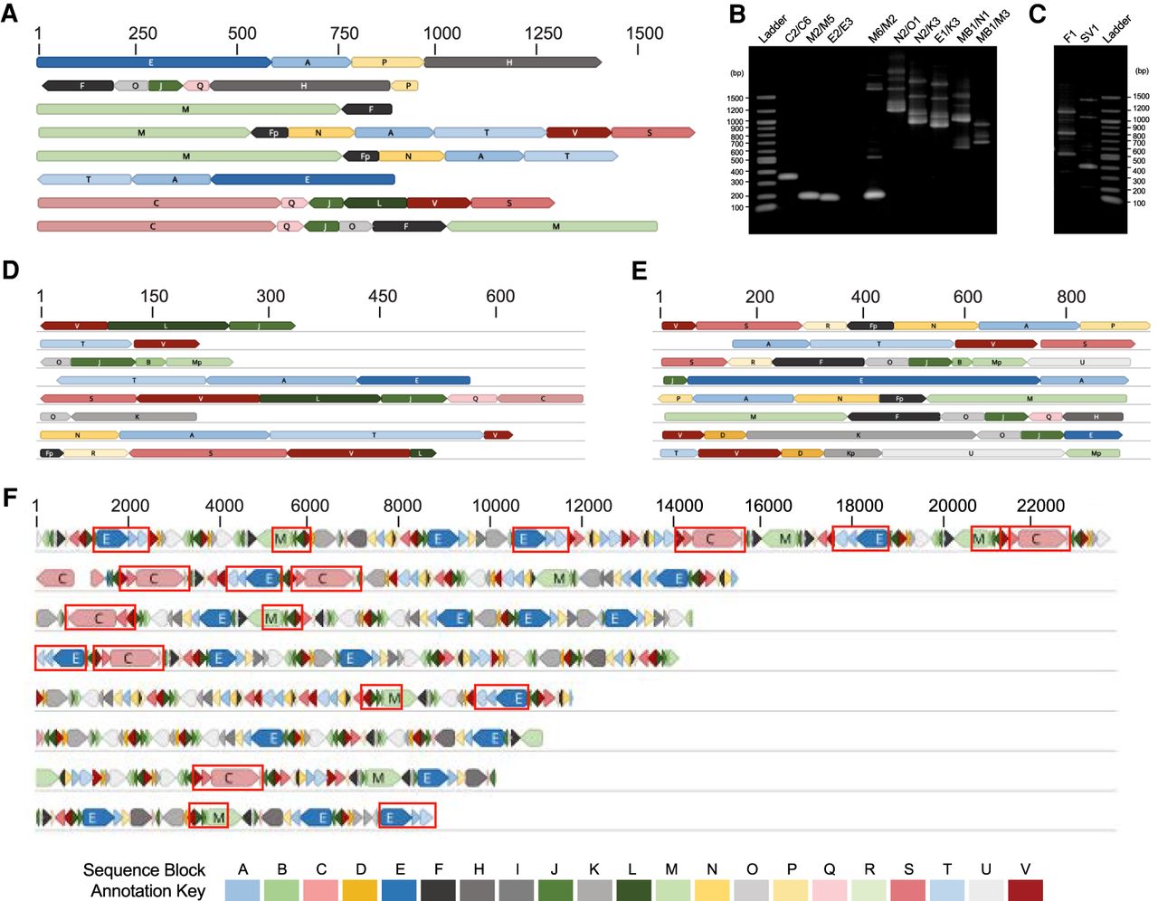 Sequence evidence of fragmented mtDNA and full-length protein-encoding genes. (A, D–F) Each row of colored blocks represents individual, annotated T. gondii (A) mtDNA-specific PCR amplicons; (D) EST reads; (E) Sanger genomic reads; or (F) Nanopore reads. Sections of reads containing identical sequence to other mtDNA reads are called “sequence blocks” (SBs) and are colored and labeled with a unique color and letter corresponding to the key, Table 1 and Figure 2. Shades of blue, red, and green represent different SBs found in cob, coxI, and coxIII, respectively. Orientation of a block is indicated by the point on each block. Red boxes in F indicate complete protein-encoding genes. SBs located on the ends of reads may be incomplete. (B) Genomic DNA from mitochondrial-enriched fractions assayed with different primer pairs (Supplemental Table S1) as indicated. Lanes 2–4 represent a small fragment of each cytochrome gene. (C) Single primers produce multiple amplicons. Scale (in bp) is as indicated in each panel. Additional reads are in Supplemental Figures S1–S4.