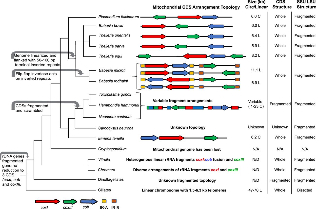 Alveolate mtDNA evolution and characteristics. (Left) Cladogram of alveolate relationships with major mitochondrial genome events indicated with gray arrows. (Center) Schematic of mtDNA CDS (red, green, and blue arrows) or inverted repeats (gold and brown) indicated. Spacing is approximate with CDS lengths exaggerated for ease of viewing. Ribosomal RNA and other RNA genes or fragments thereof are not represented. (Right) mtDNA size and topology. (L) Linear, (C) concatemer, presumably from circular progenitors. Status of CDS sequences and status of Short (SSU) and Long Subunit (LSU) rRNA are indicated.