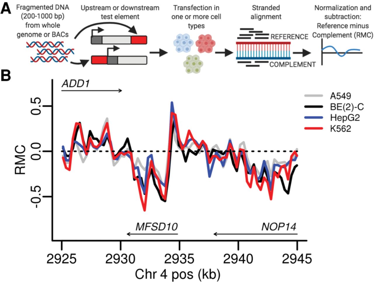 Derivation and example of RMC data. (A) DNA test elements from either BACs or whole-genome fragmentation are cloned downstream from or upstream of the TSS in different experiments. After transfection in one or more cell types, reporter-derived RNA and DNA are harvested and sequenced. The reads are mapped retaining strandedness and the normalized signal Reference strand signal minus the Complement strand signal (RMC) is calculated (created with BioRender.com). (B) RMC data from four cell lines are shown on a 20-kb portion of Chromosome 4 (hg38 coordinates). The arrows mark gene bodies and the direction of stable transcription.