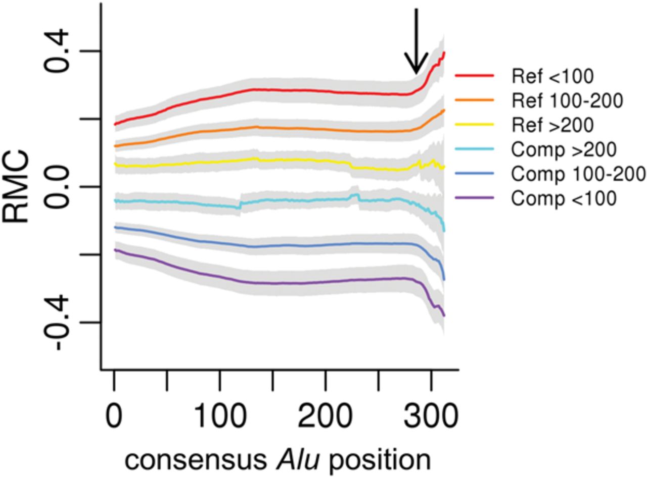 Alu divergence level effects strand asymmetry. From the Johnson et al. data, the genome-wide median RMC (y-axis) for each annotated Alu consensus position (x-axis) is plotted for Reference (Ref)- or Complement (Comp)-oriented Alu insertions, grouped by levels of divergence (indicated in respective colors) measured by milliDiv units (e.g., <100 corresponds to <10% divergence from the ancestral consensus; see Methods). The gray bands represent two standard deviations from the median. The black arrow indicates the start of the A-tail sequence.