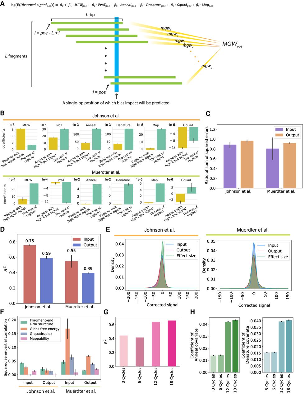 The CRADLE GLM approach accurately predicts signal bias. (A) Equation of the GLM to predict the impact of technical biases and approach used by CRADLE to calculate bias covariates. To estimate bias effects for each position (blue), we used a window centered on that position that was twice the median fragment length, L. We assume L number of fragments (green) in a window and that each fragment is L-bp in length. To calculate each bias covariate for the position, we combined quantitative measures from L fragments. (pos) Single-bp position; (MGWpos) minor grove width; (ProTpos) propeller twist; (Annealpos) annealing efficiency; (Denaturepos) denaturation efficiency; (Gquadpos) G-quadruplex structure; (Mappos) mappability. (B)–(F) The results from the GLM fitted with Johnson et al. (2018) STARR-seq data (six input libraries and five 0-h dex-treated output libraries) and Muerdter et al. (2018) STARR-seq data (two input libraries and two no-inhibitor-treated output libraries). For C–F, the results were visualized for Chromosome 1. (B) Coefficients in input libraries for regions with signals above and below the 90th percentile (“Regions with high input signal” and “The rest of regions,” respectively). (C) Ratio of the sum of squared errors with structured sampling to the sum of squared errors with random sampling are plotted for regions with extremely high signals (above the 99th percentile). (D) Variance explained by CRADLE are plotted. The R2 values are from GLMs fitted with input and output STARR-seq libraries. The error bars indicate variance between replicates. (E) Distribution of GLM residuals and the STARR-seq effect sizes are shown after correction. (F) Squared semipartial correlations are shown for fragment-end, Gibbs free energy, G-quadruplex, and mappability covariates. The error bars indicate variance between replicates. (G) The R2 values of the GLMs are shown for PER1 BAC libraries amplified with different numbers of PCR cycles. (H) Coefficients of anneal and denature covariates are shown for the GLM fitted with PER1 BAC libraries. The error bars show a 95% confidence interval.