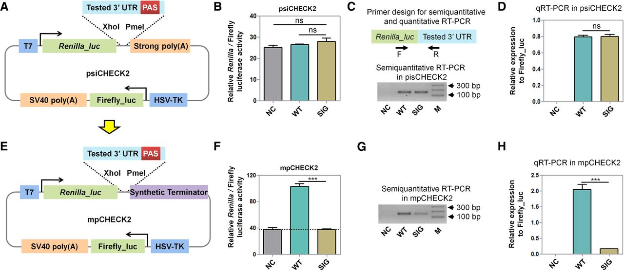 The establishment of an mpCHECK2 system to evaluate the effect of PAS variants. (A) The schematic diagram of the original psiCHECK2 vector with a highly efficient synthetic PAS downstream of the tested 3′ UTR (labeled strong polyA). (B) Renilla luciferase activity (normalized by firefly) in HUVEC transfected using psiCHECK2 without a tested 3′ UTR (NC), with the 3′ UTR of HBA2 containing a WT PAS (AATAAA) (WT), and a 3′ UTR of HBA2 containing a mutated PAS (GGATCC) (SIG), respectively. (C,D) Comparison of mRNA expression levels among NC, WT, and SIG (based on psiCHECK2, described in panel B, that was transfected into HUVEC cells using both semiquantitative PCR (C) and qRT-PCR (D). Primer design is illustrated on the top and M denotes molecular size markers. (E) The modified mpCHECK2 vector resulted from replacing the strong PAS in psiCHECK2 with a highly efficient synthetic terminator. (F) Comparison of normalized Renilla luciferase activity in HUVEC transfected with mpCHECK2 vector (panel E) of NC, WT, and SIG, as described above. Dashed line indicates the basal luciferase signal of NC. (G,H) Comparison of mRNA expression levels in HUVEC transfected with NC, WT, and SIG (based on mpCHECK2) using semiquantitative PCR (G) and qRT-PCR (H). All luciferase activity assays were performed with four replicates and all qRT-PCR reactions were carried out with three replicates. Data are presented as mean ± SEM. (***) P < 0.001, (ns) not significant; one-way ANOVA test.