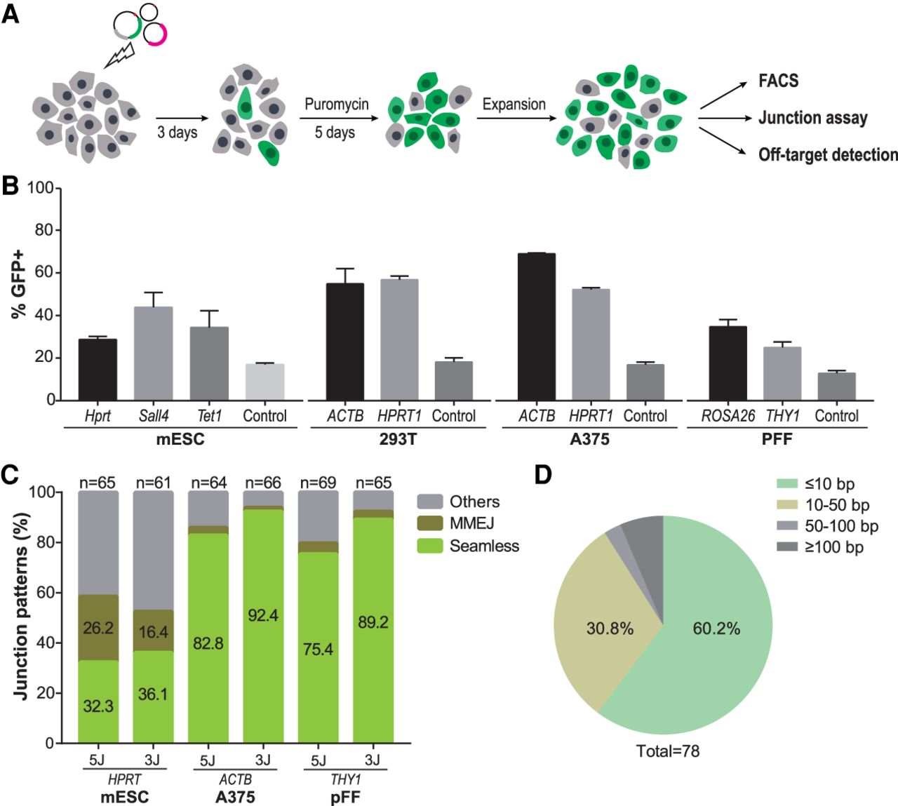 Systematic assessment of the HIT-trapping method in mammalian cells. (A) Flowchart of the experimental design. (B) HIT-trapping efficiencies were measured by the percentage of GFP-positive cells among puromycin-resistant cells. As controls, plasmid mixtures without gene-specific sgRNA expressing vectors were transfected into the cells. These results were derived from at least two independent experiments, shown as mean ± SD. (C) Frequencies and ratios of seamless, microhomology-mediated end joining (MMEJ), and other integration junctions at the target loci. (n) Number of the amplicons analyzed; (5/3J) 5′/3′ junction. (D) Summary statistics of the deletion sizes from junction sequencing. Sequencing data are presented in Supplemental Figure S6.