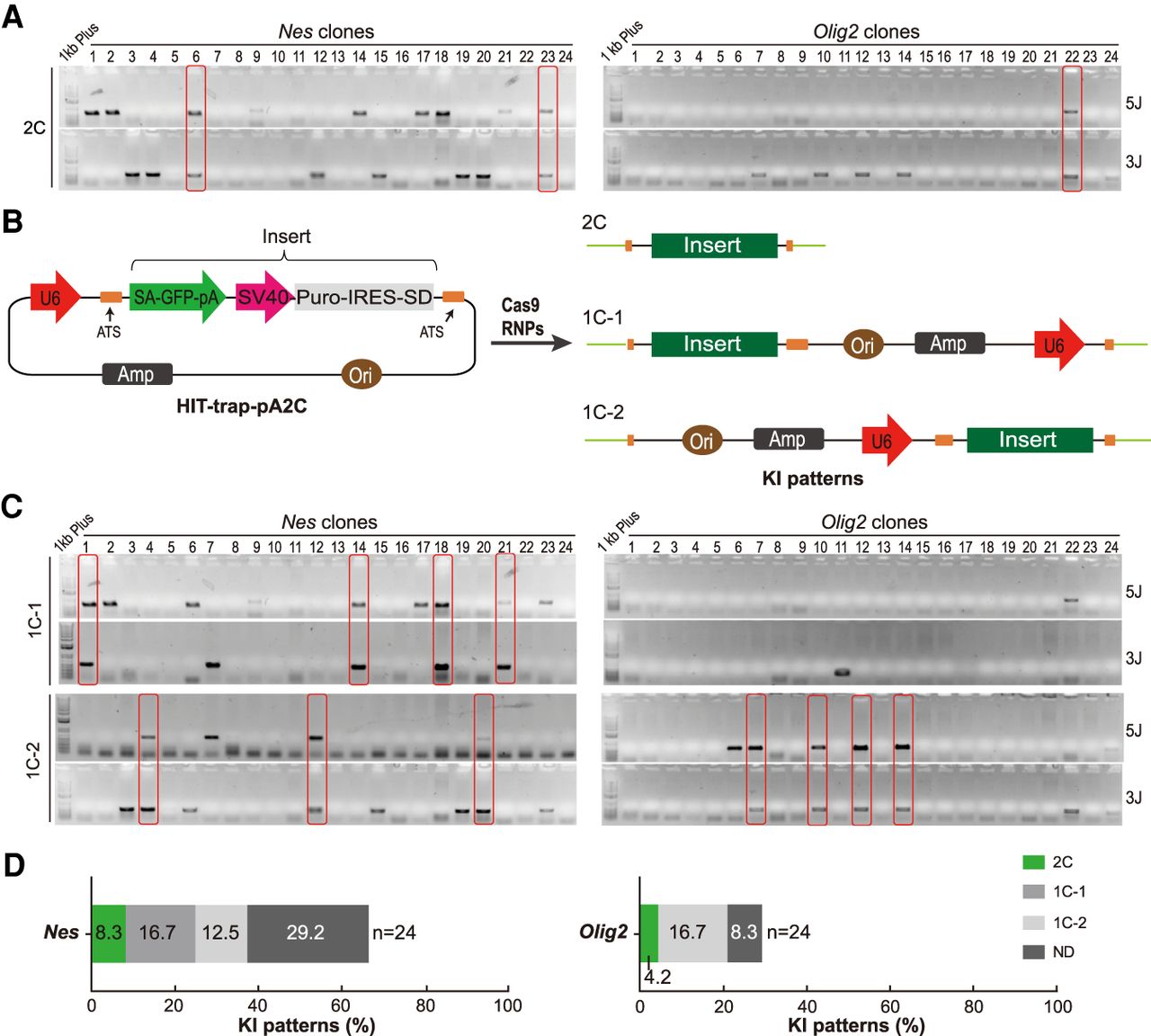 Various knock-in patterns generated by a two-cut HIT-trap donor. (A) PCR genotyping of the puromycin-resistant clones by targeted trapping of Nes and Olig2 in mESCs. The lanes in red rectangles indicate desired 2C knock-in patterns. (B) Schematic showing the desired and alternative knock-in patterns by a two-cut donor (HIT-trap-pA2C). SV40-Puro-IRES-SD (poly(A)-trap cassette), SV40 promoter driving expression of a puromycin-resistance gene followed by sequences of an internal ribosome entry site (IRES) and a splice donor (SD). (C) PCR genotyping verified the predicted alternative knock-in patterns (1C-1 and 1C-2) at the Nes and Olig2 loci in mESCs. The lanes in red rectangles indicate the defined alternative knock-in pattern. (5/3J) 5′/3′ junction. (D) Distribution of different knock-in patterns by HIT-trap-PA2C. (n) Number of clones checked by PCR; (ND) not determined.