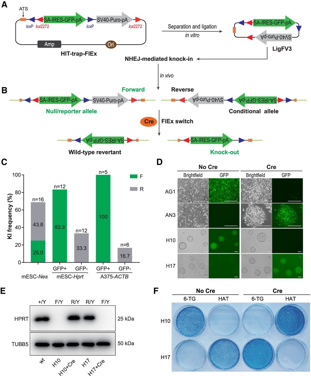 Combining HIT-trapping and FlEx switch enabled the simultaneous generation of reversible and conditional knockouts. (A,B) Schematic showing the workflow and mechanism for simultaneous generation of reversible and conditional knockouts at target sites. Optimized donor LigFV3 was generated through self-ligation of the insertion cassette, excised from the plasmid HIT-trap-FlEx in vitro. Because of the nondirectional feature of NHEJ-mediated knock-in, cells containing either forward or reverse integration can be obtained in a single transfection step. The Cre-mediated FlEx switch enabled the inversion of the gene-trap cassette post insertion, leading to phenotype reverted or conditional knockout. Blue triangles indicate loxP sites; red triangles, lox2272 sites. (C) Knock-in efficiencies of optimized donor LigFV3 at various target sites. (F/R) Forward/reverse integration of the donor; (n) number of screened clones. The genotyping and Sanger sequencing data are presented in Supplemental Figure S11. (D) Images of A375 cells and mESCs bearing FlEx-trap insertions transfected with a Cre expressing plasmid. (AG1/AN3) A375 cell clones with donor insertion at ACTB locus in forward/reverse orientation; (H10/H17) mESC clones with donor insertion at Hprt locus in forward/reverse orientation. Scale bar, 50 µm. (E) Western blot confirmation of the wild-type revertant and conditional knockout phenotypes of Hprt after exposure to Cre in mESCs, with TUBB5 as the loading control. (Y) Y Chromosome (Hprt locus is located on the X Chromosome). (F) Methylene blue staining of mESCs mentioned above. mESCs were cultured with 6-TG (2 μM) or 1× HAT supplement for 5 d and were fixed and stained with 0.02% methylene blue.